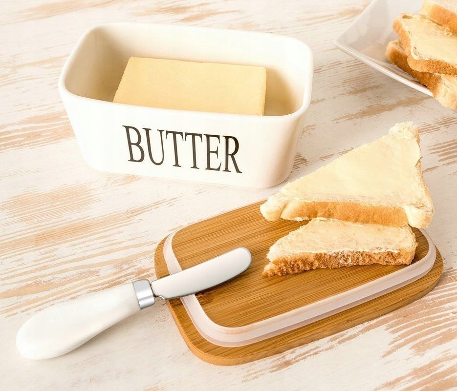 Красивая и стильная фарфоровая масленка с бамбуковой крышкой и ножом для намазывания масла. Оно прекрасно смотрится на столе и сохраняет масло свежим. Бамбуковая крышка с силиконовым уплотнителем также имеет место для аккуратного ножа для смазки с керамической ручкой. Со вкусом и со вкусом.