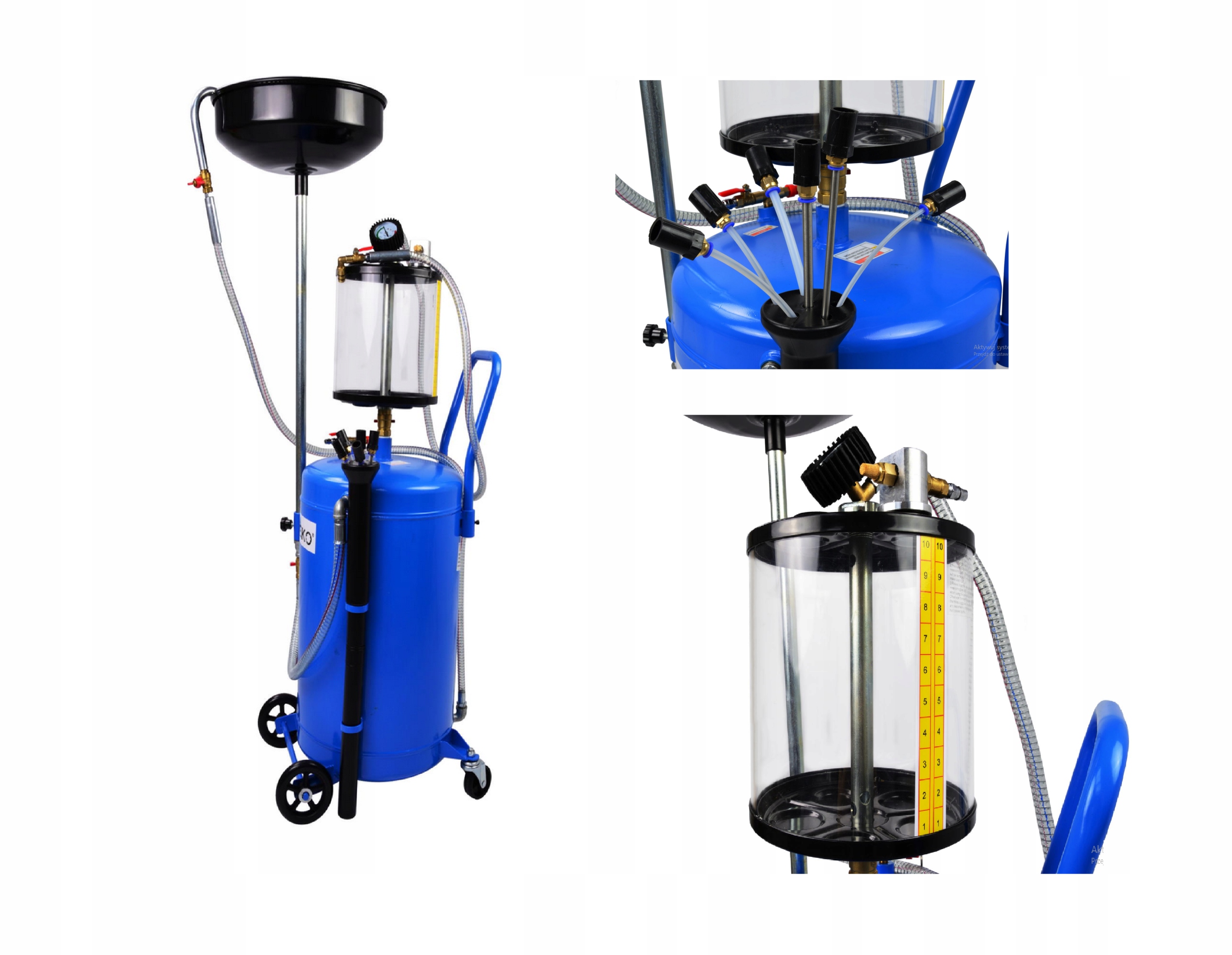 Профессиональный пневматический маслоотделитель, оснащенный баком емкостью 80 литров и набором из 6 всасывающих зондов.