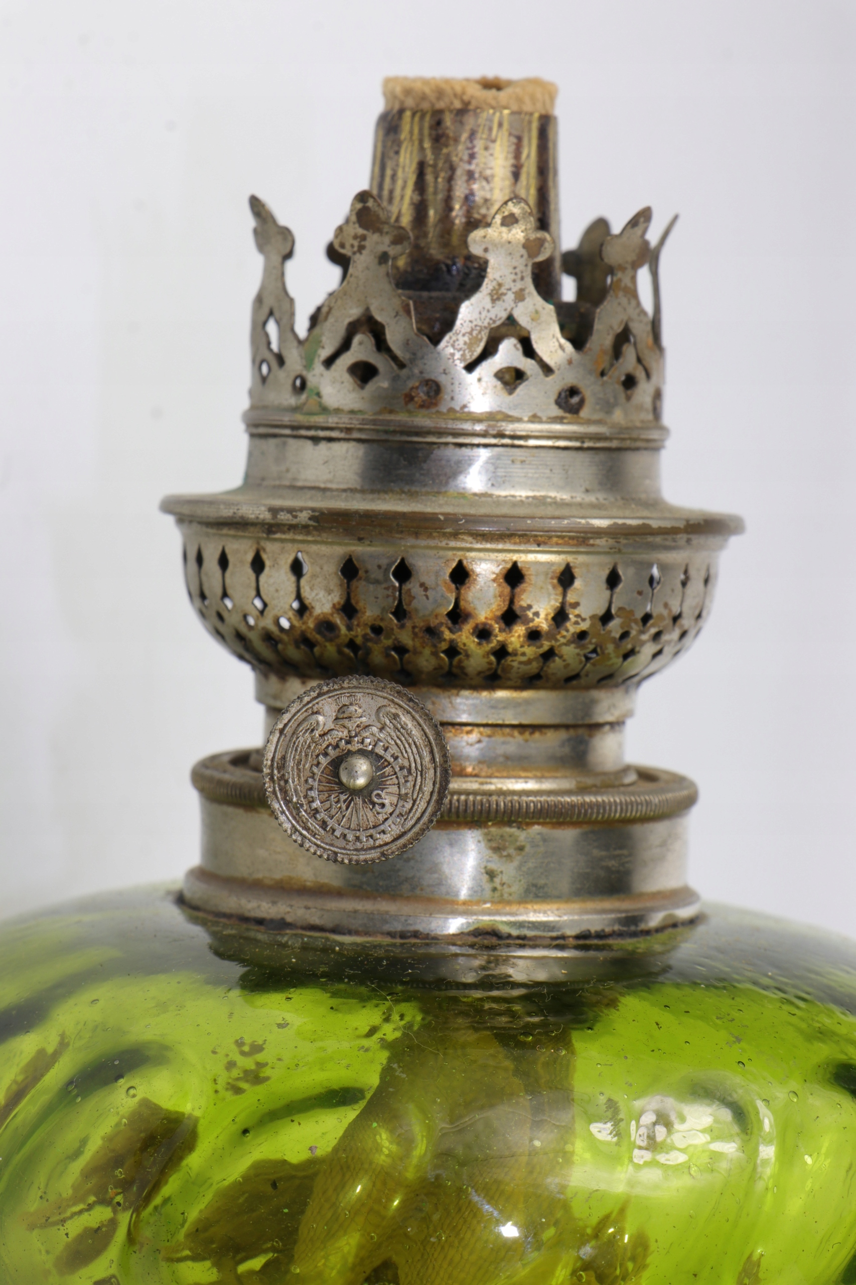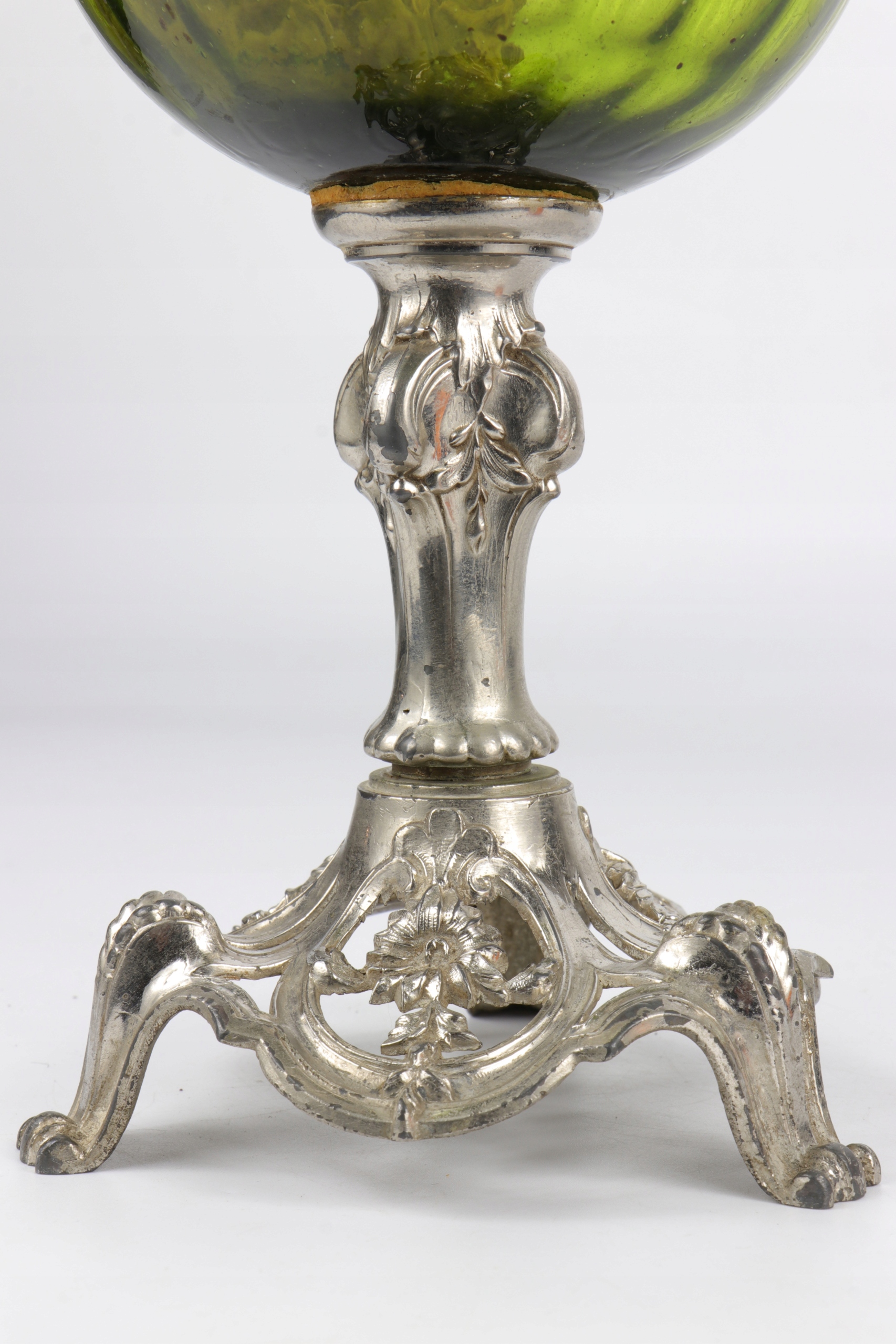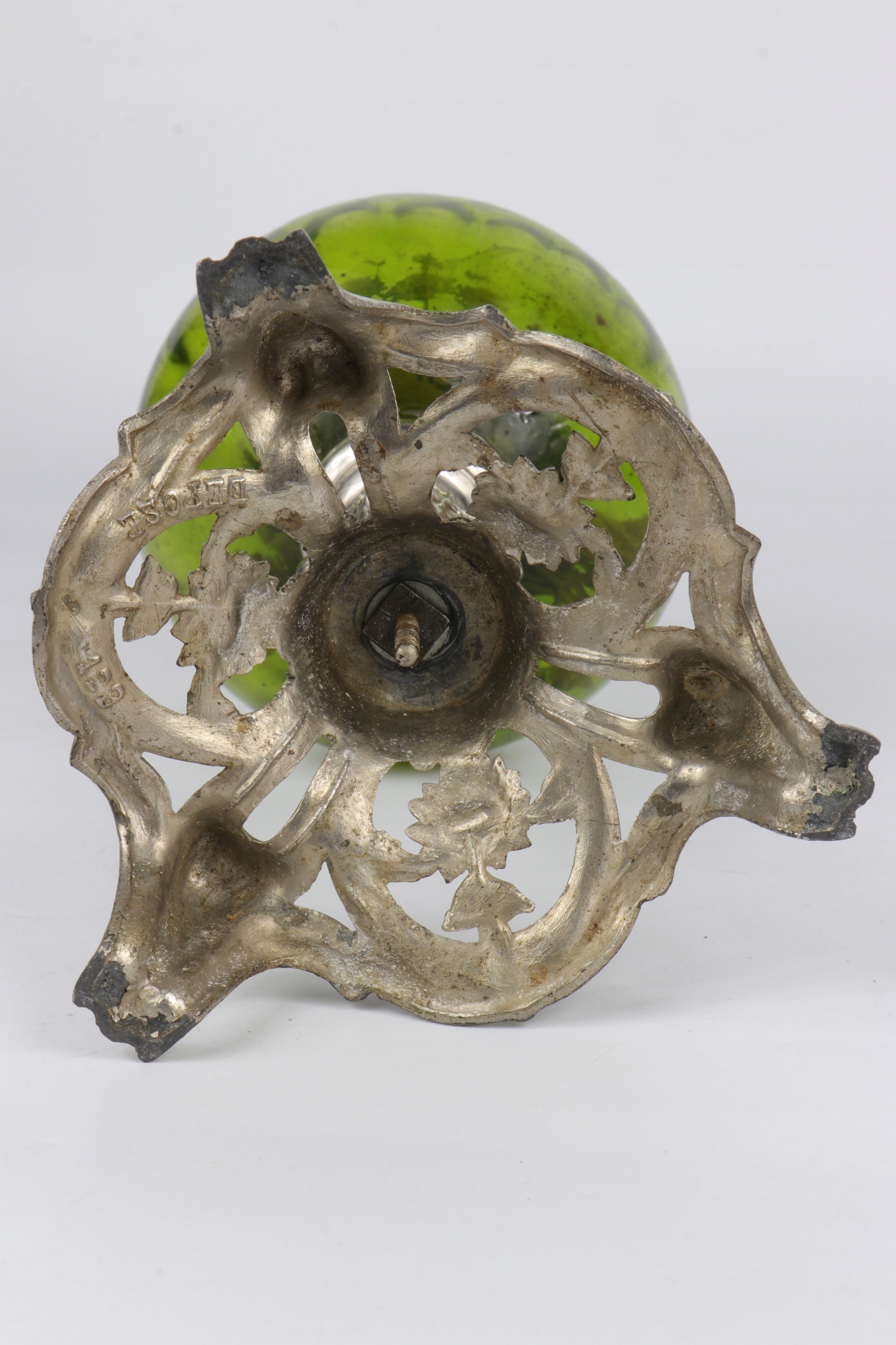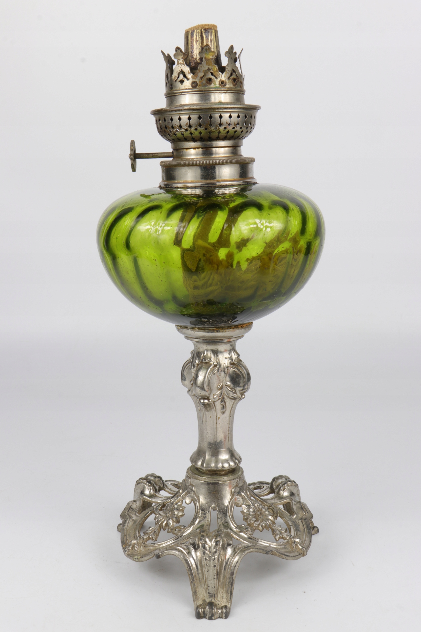 Французская керосиновая лампа с емкостью из зеленого стекла для керосина. Основание изготовлено из никелированного оловянного сплава с очень богатым орнаментом в стиле рококо. Резервуар изготовлен из зеленого стекла с интересным орнаментом. Внизу надпись Depose 129, зарегистрированный дизайн.