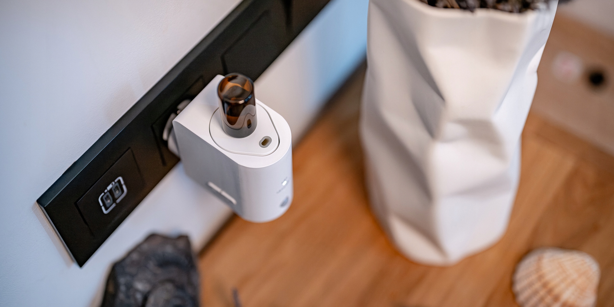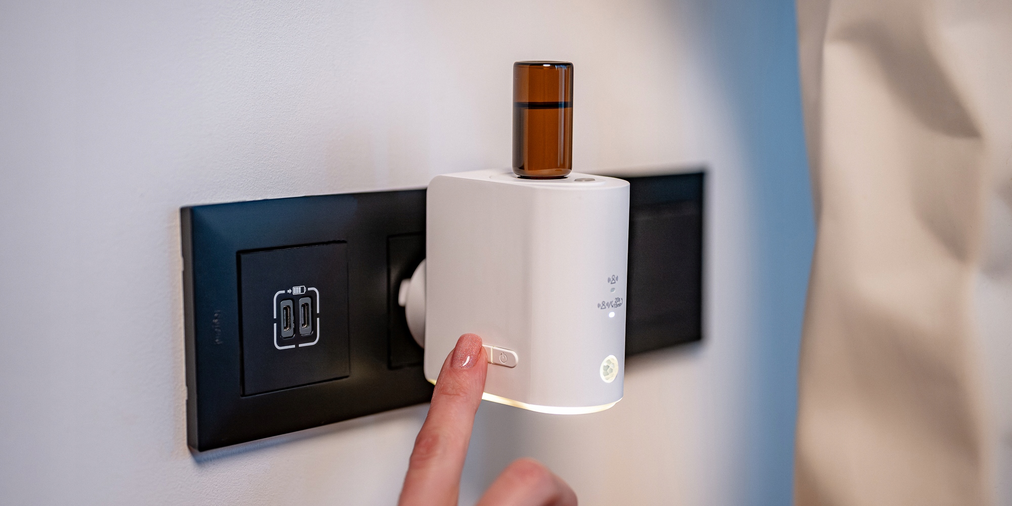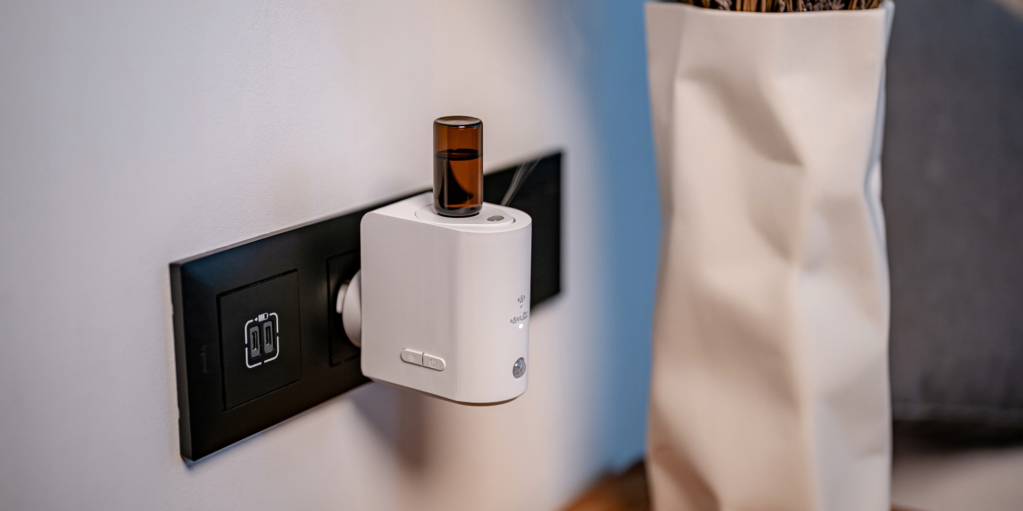 Не все розетки расположены одинаково: некоторые устанавливаются вертикально, другие — горизонтально. Именно поэтому ароматизатор-ароматизатор Humanas Home Spirit с датчиком движения оснащен поворотной заглушкой, которая позволяет всегда устанавливать прибор в правильном положении, флаконом вниз. Благодаря этому диффузия происходит правильно. Это простой, но чрезвычайно практичный элемент дизайна, который облегчает установку практически в любом помещении.