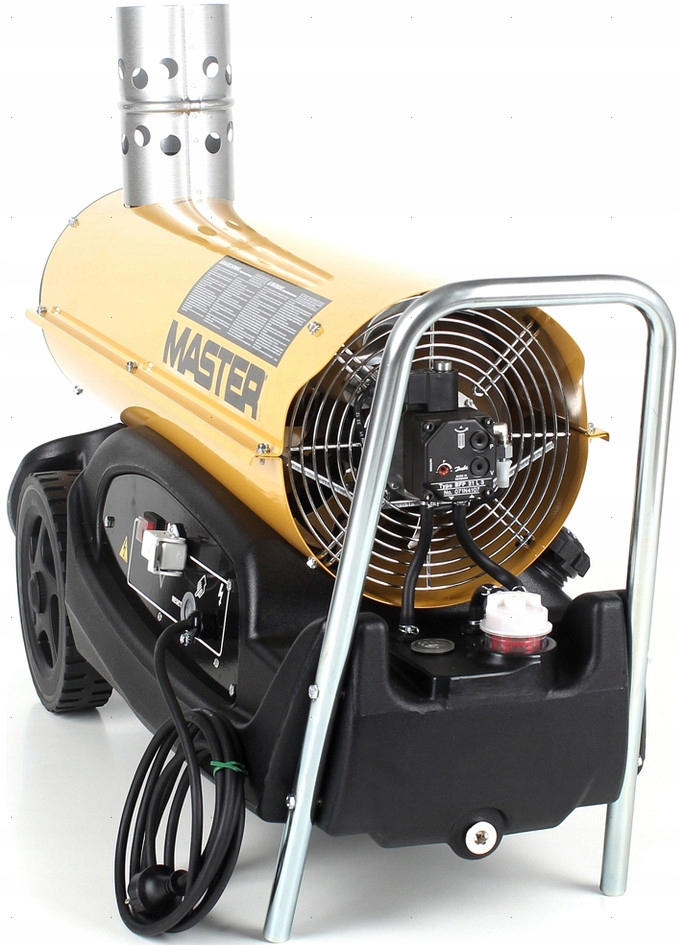 MASTER BV77E — портативный, профессиональный и полностью автоматический масляный обогреватель с отводом выхлопных газов. Камера сгорания изготовлена из нержавеющей стали. Корпус обогревателя утеплен, поэтому не нагревается во время использования. Для облегчения транспортировки обогреватели оснащены колесами, подставками и поручнями. Все устройства имеют встроенный масляный бак. Питание вентилятора и автоматики - 230В.