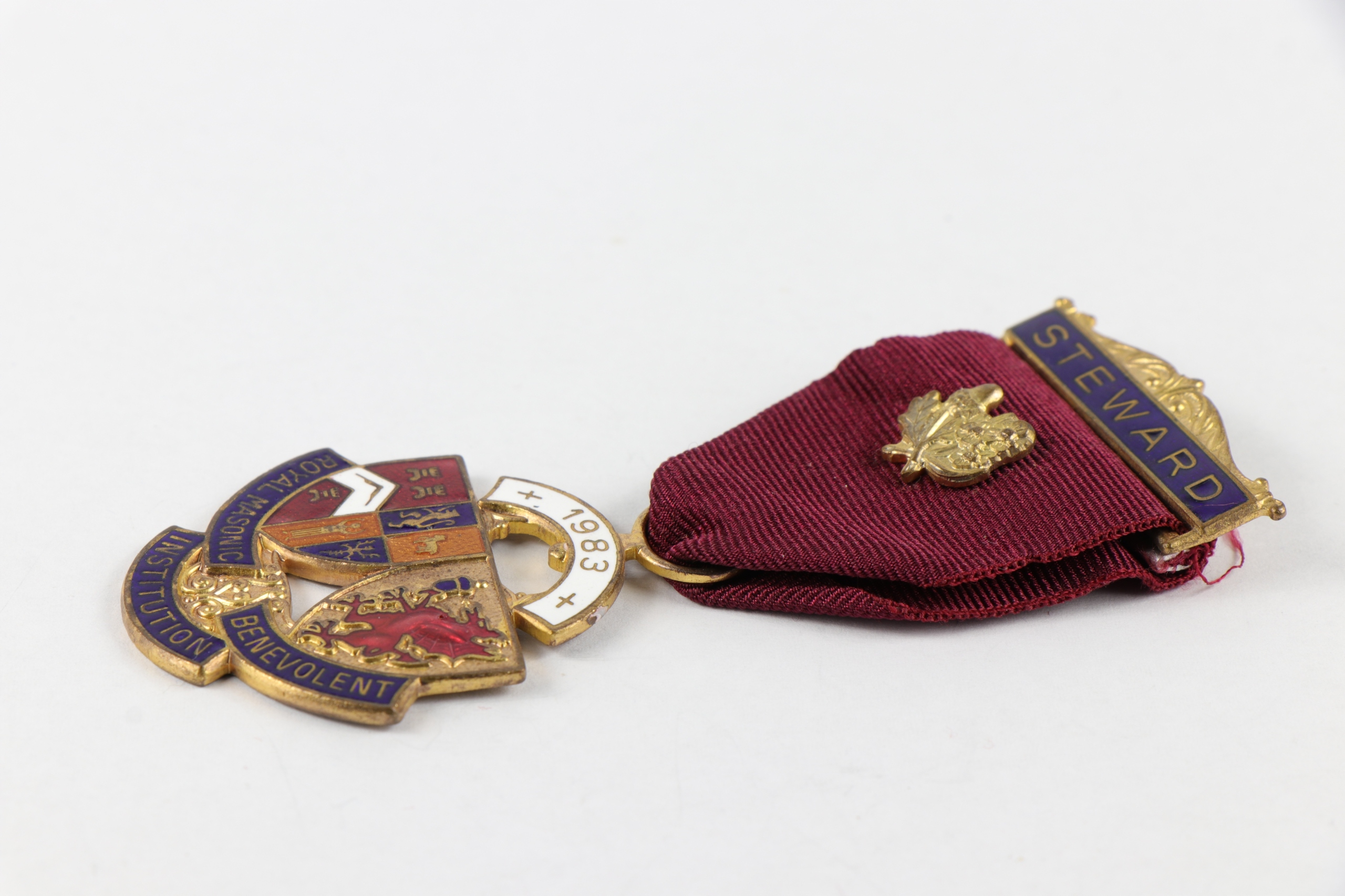 Масонская медаль из некоторого металлического сплава, покрытого эмалью. Медаль Стюард 1983 Королевский масонский доброжелательный институт. На медаль, ссылочный номер Toy Kenning Spencer. На других аукционах я выпускаю другие масонские предметы.