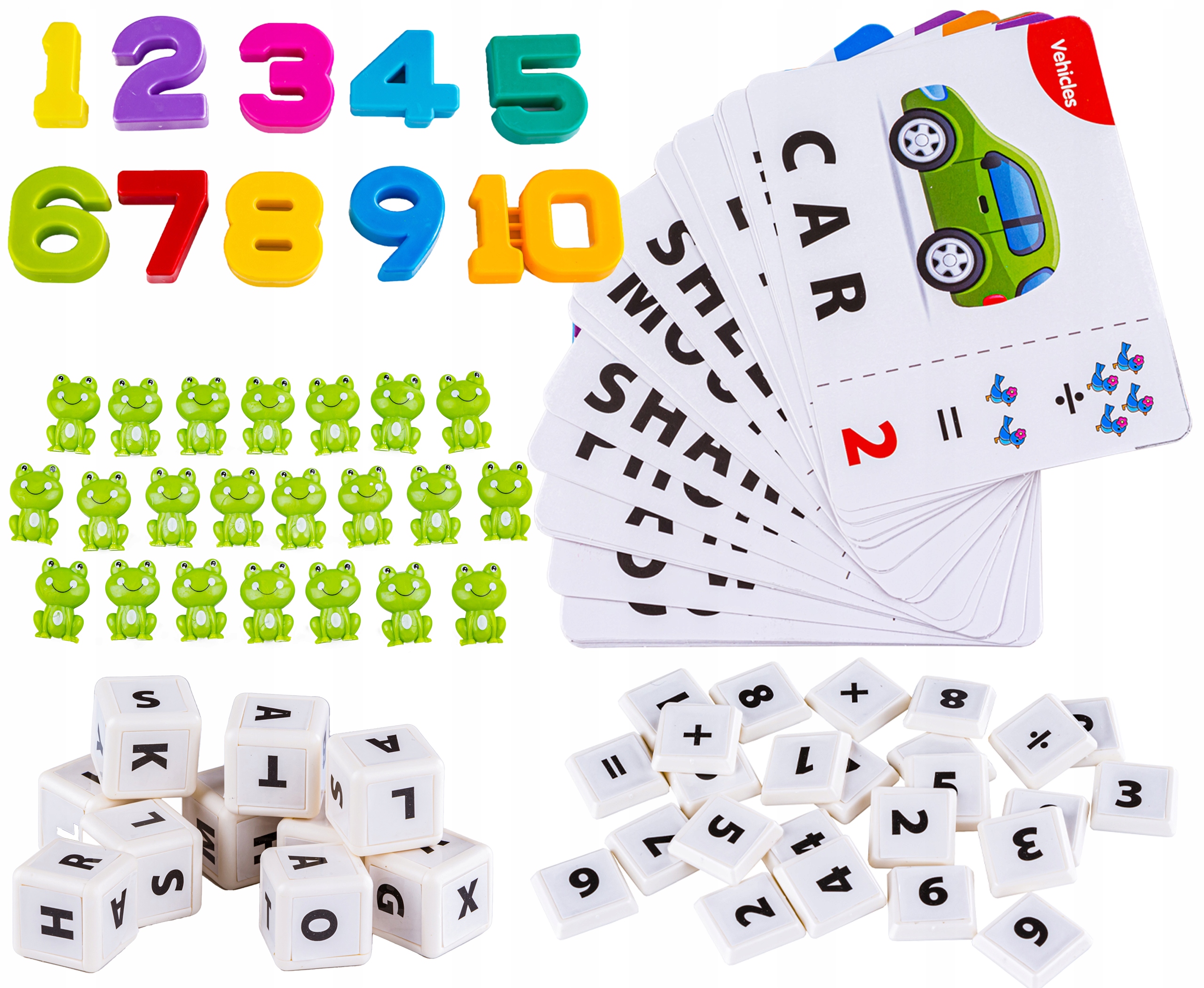 С помощью красочных карточек ребенок изучает английские названия различных предметов. Карты помогают распознавать буквы, писать слова, составлять слова и узнавать предметы. Карты двусторонние: они содержат как пазлы с картинками, чтобы отгадать название предмета, так и математическую головоломку.