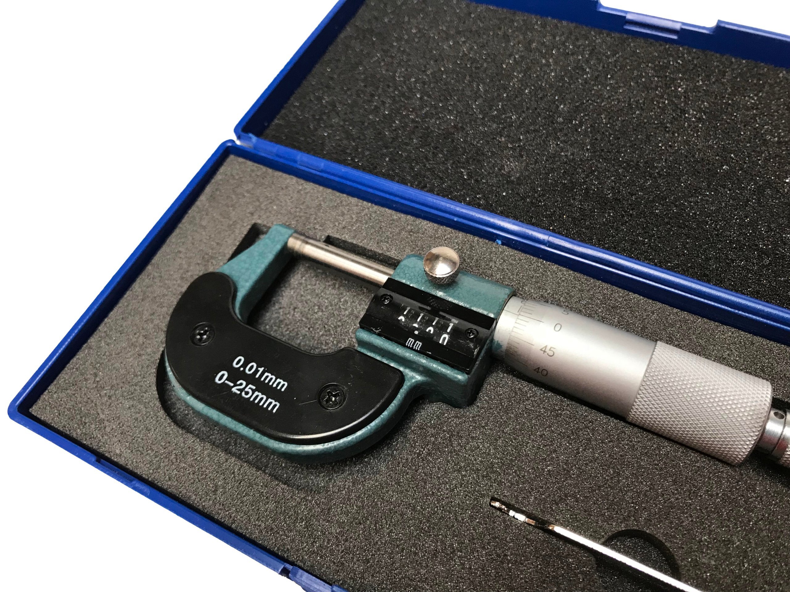 Микрометр (также называемый микромьером, чтобы отличить микрометр в качестве измерительного блока) - измерительное устройство для точного измерения. Работа устройства основана на использовании винта микрометра, а не микрометрический винт представляет собой очень точно изготовленный винт с штрихом резьбы 1 мм, подключенным к барабану микрометра, по периметру которого была выгравирована шкала. Ручка, обеспечивающая правое, постоянное давление челюсти, соединяется с помощью сцепления с помощью барабана микрометра. Неадекватное давление вызывает значительную неточность измерения. Целое упаковано в практическую сильную коробку.