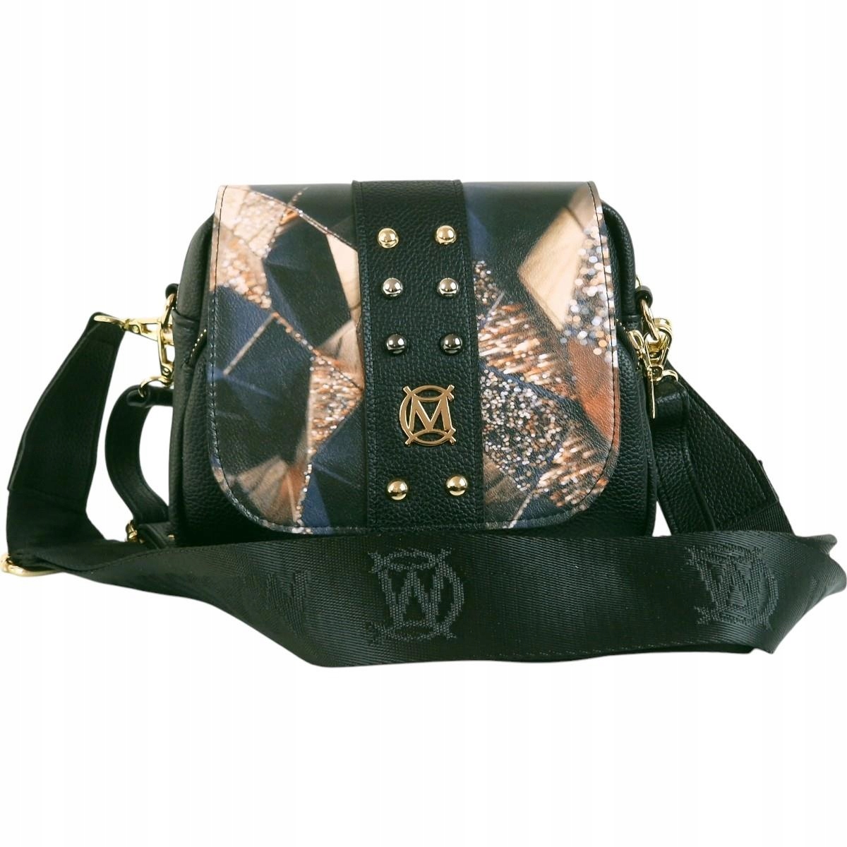 сумка для плеча с магнитом, прикрепленным магнитом. На лоскуте золотого логотипа бренда и стразах в трех цветах