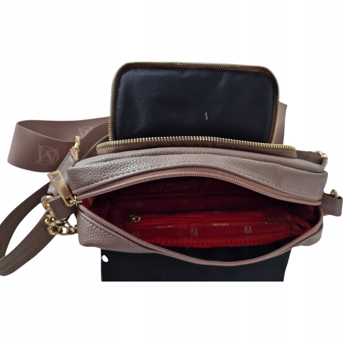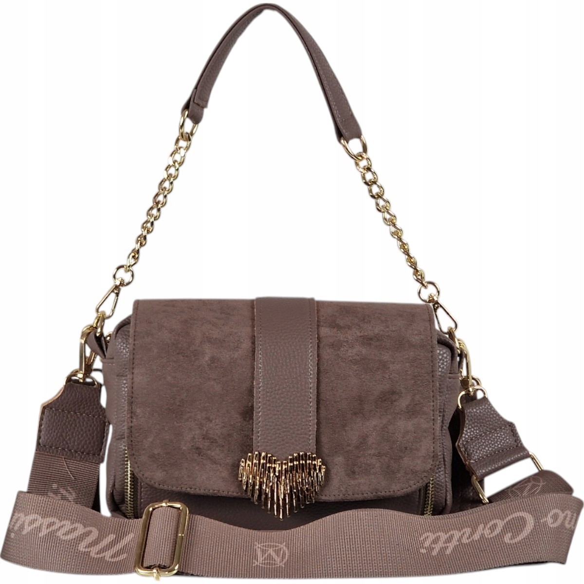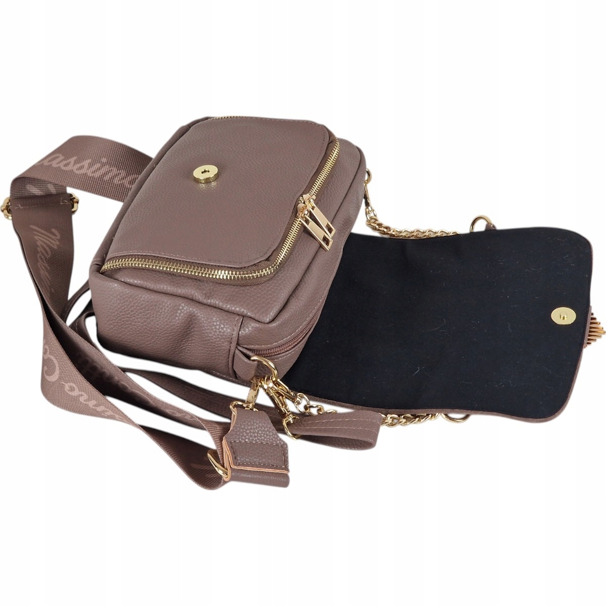 Две независимые камеры (большие и маленькие) для молнии, спрятанной под магнитом, прикрепленным магнитом, украшенным золотым сердцем в задней части кармана молнии. В более крупной камере, молнии и открытого кармана. Интерьер обрезан зарегистрированной подкладкой. Включает две регулируемые полосы, которые позволяют вам адаптировать сумку к вашим собственным предпочтениям. Материал, широкий пояс с логотипом и классической экологической кожей. Удобное съемное ухо - золотая цепочка, соединенная с экологической кожей.