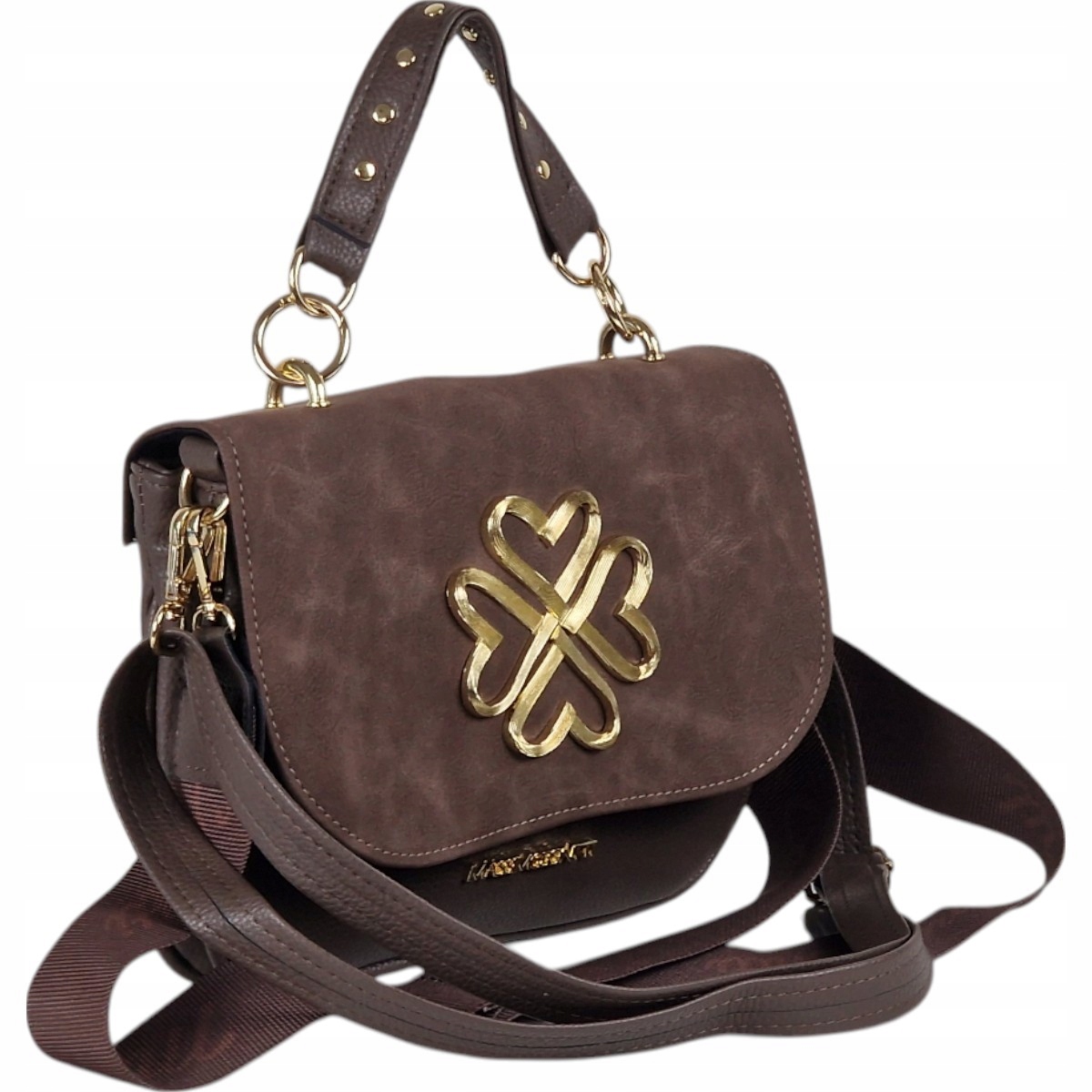 Две камеры для молнии и одна открытая спрятана под замшей, прикрепленная магнитом. На передней части логотипа бренда в золоте. Клапкол украшен золотыми сердцами. На задней части кармана молнии. Кроме того, в одной камере, закрепленной на молнии, открытым карманом и в другой на ползунке, в наборе две регулируемые полосы, которые позволяют настроить сумку в свои собственные предпочтения. Материал, широкий пояс с логотипом и классической экологической кожей. Удобная съемная экологическая кожаная ручка, украшенная стразами.