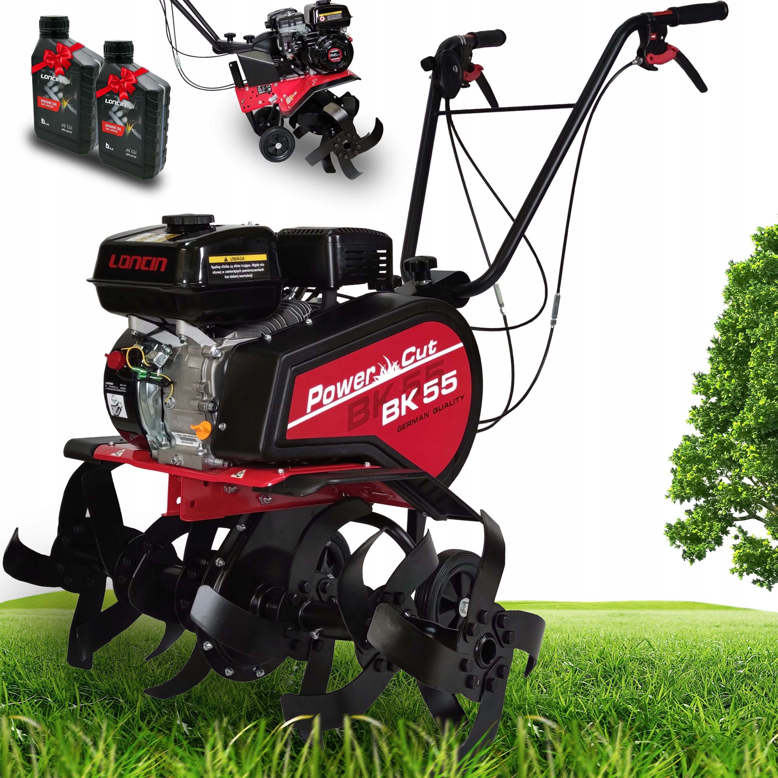 Powercut BK-55-2L-это мощный румпель сжигания с приводом с натягиванием. Поездка на ножи переносится с цепью, заключенной в металлический корпус. Крышка цепи состоит из двух половинок, соединенных с винтами, она дает легкий доступ к шестерням оси и приводной цепи при обслуживании устройства. Оси ножей с повышенным диаметром (30 мм!), А также прочность, легко выдерживая работу как с ножами, а также работают с металлическими и резиновыми колесами.