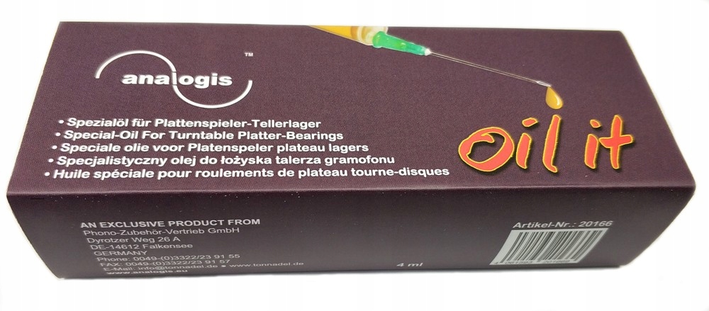 Для правильной работы вашего проигрывателя раз в несколько лет необходимо смазывать несколько элементов привода проигрывателя, ось диска, направляющую рычага, некоторые элементы автоматики и подшипники двигателя, конечно, если он оснащен маслом. распылитель. Проведение данных мероприятий улучшит качество воспроизведения пластинки и значительно продлит срок службы проигрывателя. На этом аукционе мы предлагаем специальное силиконово-тефлоновое масло высочайшего качества, созданное специально для требовательных элементов точной механики привода и систем управления рычагами поворотных кругов.