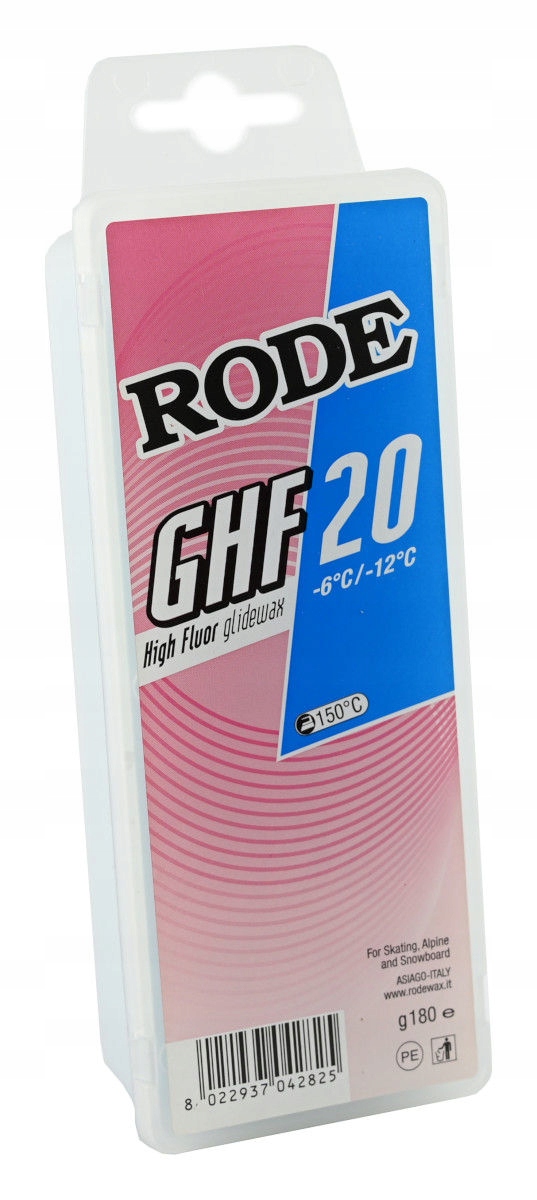 Смазка с высоким содержанием фтора для горных лыж, беговых лыж или сноубордов, продукт итальянской компании RODE, модель GHF20 Blue (каталожный номер GHF20-180), в большом кубике весом 180г. Смазка упакована в пластиковую, маркированную и закрытую коробку.