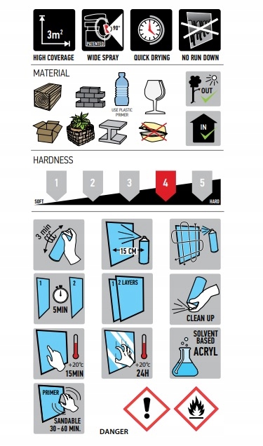 Maston One® содержит на 20 % меньше пропеллентов, на 25 % больше связующих веществ. и в 4 раза больше цветных пигментов, чем в обычных аэрозольных красках.