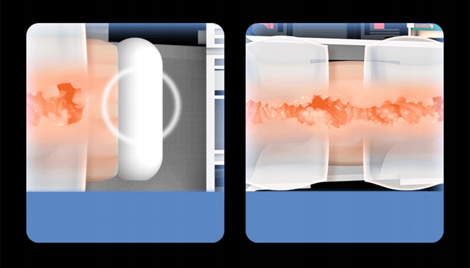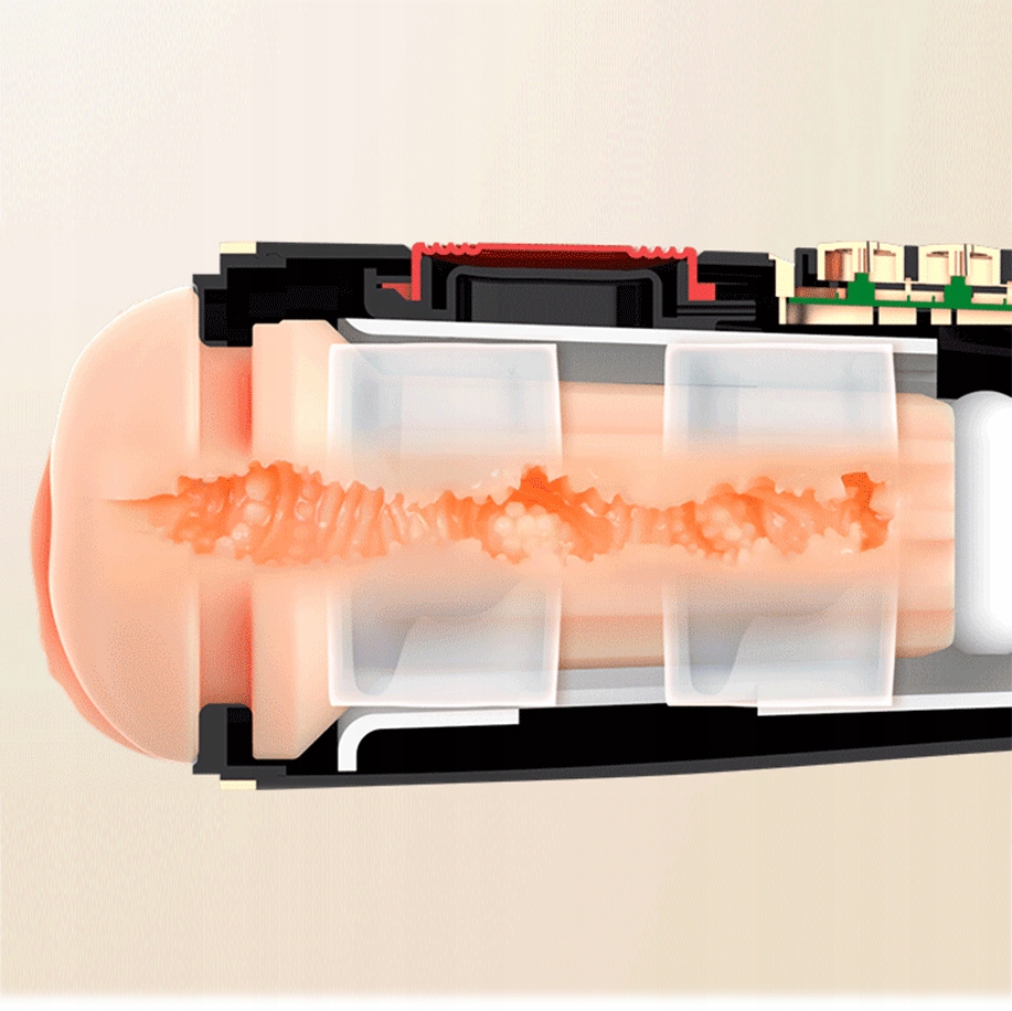 Массажер оснащен двумя рядами подушек безопасности, которые надуваются, сжимают пенис, обволакивают его и сжимают, как в настоящем влагалище.