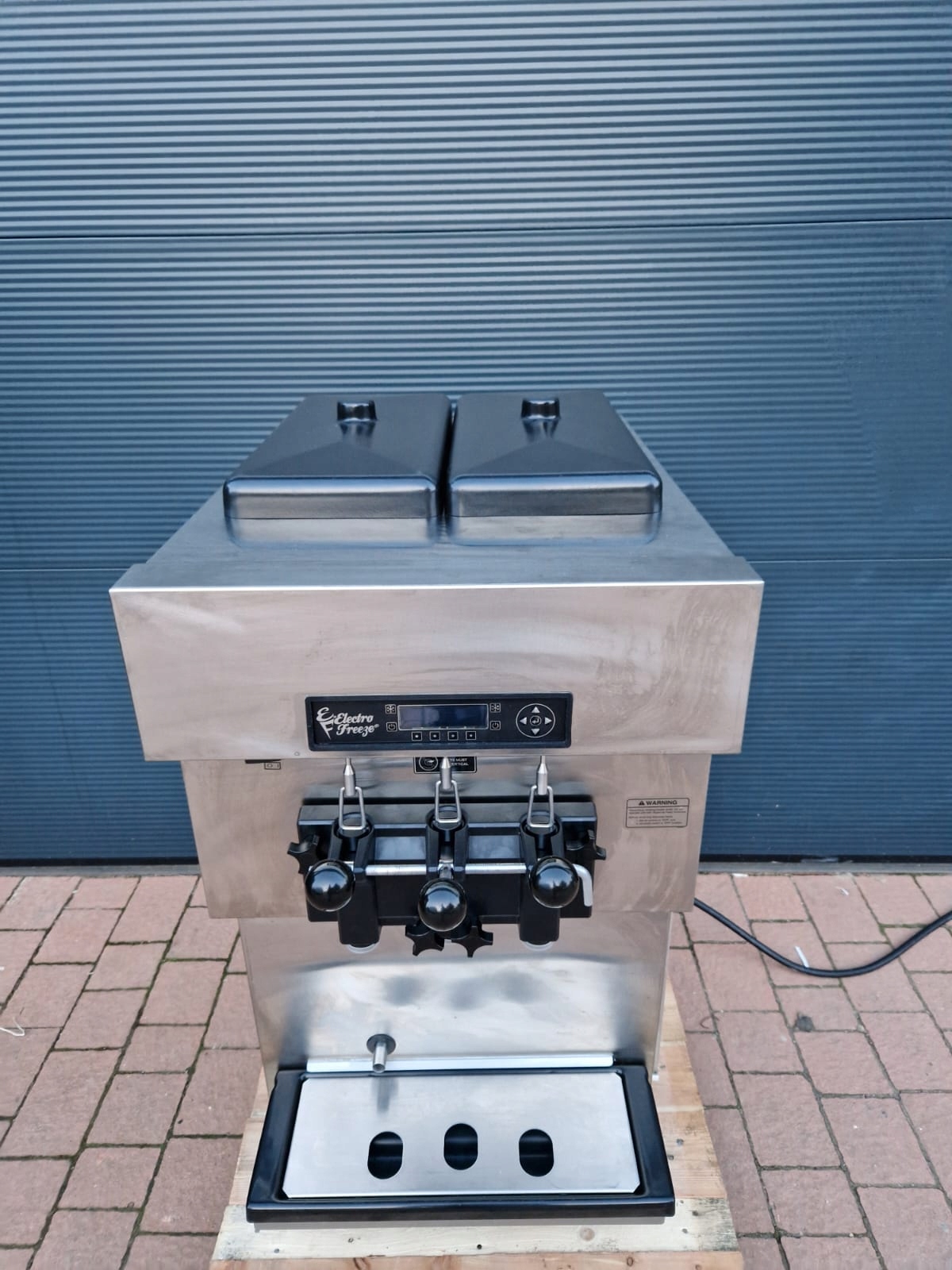 Гравитационная, настольная машина для мороженого (2 вкуса + смесь), производительностью 675 порций мороженого в час. Машина имеет два бака для смеси емкостью по 11,5 литров каждый. Емкость цилиндров, в которых замораживается смесь, - по 2,6 литра каждый.