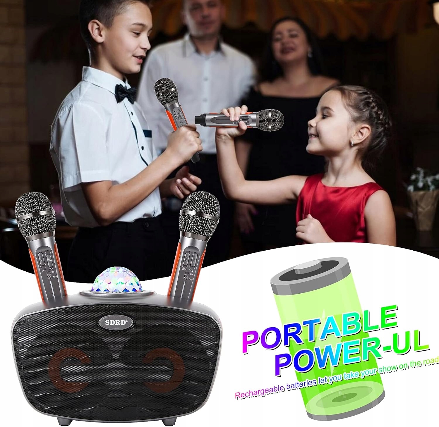 Maszyna do karaoke RUBEHOOW 2 mikrofony bezprzewodowe + kula świetlna