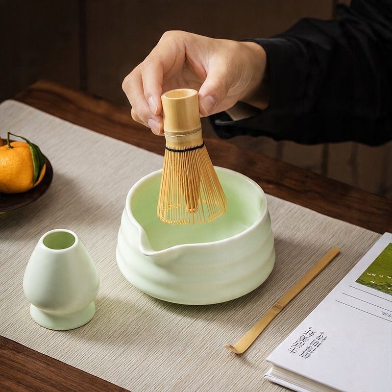 Матча с бамбуковой метлой, миской и керамическими аксессуарами