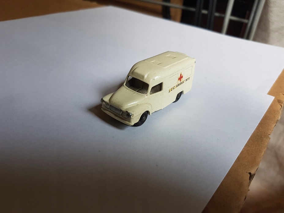 Привет. Я предлагаю на продажу модель Matchbox Lesney, Lomas Ambulance - уникальный. Состояние на фотографиях, размеры: длиной 6,5 см, шириной 2,2 см, высота 2,8 см. Без коробки металлическая модель.