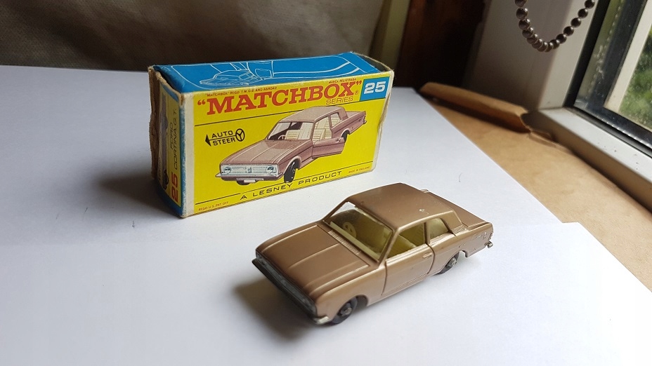 Привет. Я предлагаю на продажу модель Matchbox Lesney, Ford Cortina - уникальный. Состояние на фотографиях, размеры: длиной 7 см, шириной 2,5 см, высотой 2 см. Оригинальная коробка - приклеенная, металлическая модель.