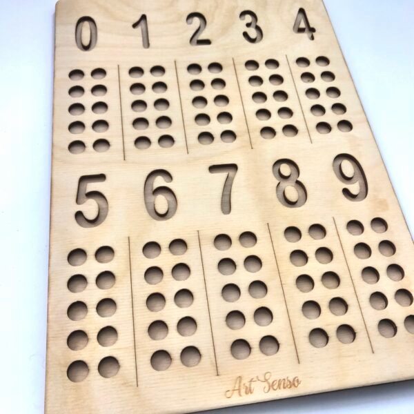 Наша доска не только позволит вам легко и удобно учить числа, но и поможет развитию мелкой моторики благодаря входящим в комплект фетровым шарикам и деревянным щипцам.