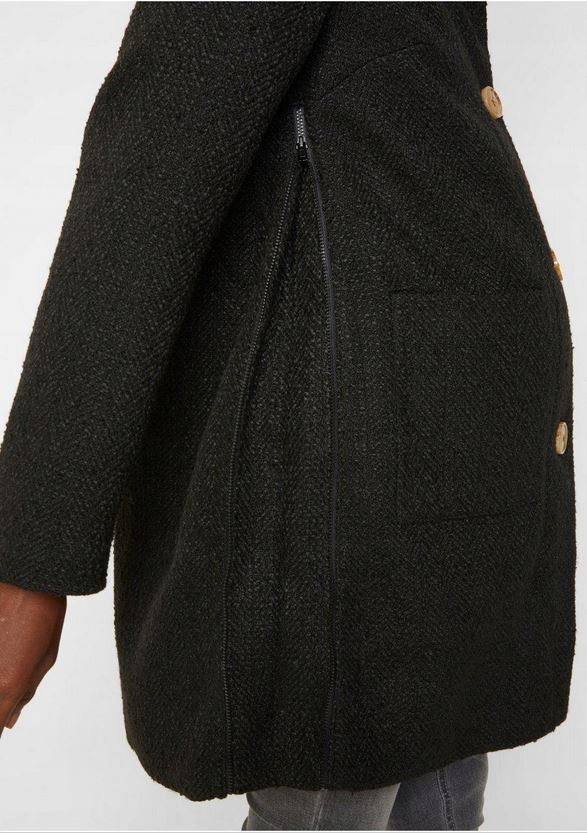 , закрепленный пуговицами, без капюшона, 2 кармана внизу, у боковых швов от нижней части куртки, молнии с возможностью его увеличивают. На подкладке. Идеально подходит для беременности/после родов в течение переходного периода. Не изолирован.