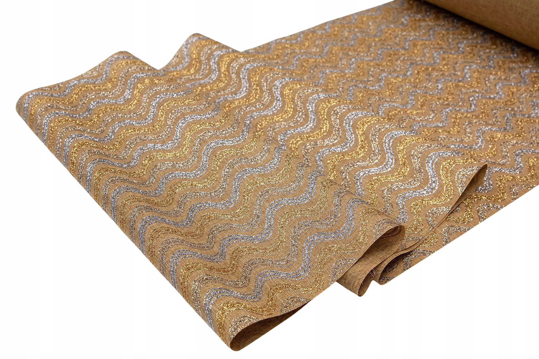 ЛЕН МАТЕРИАЛ С БЛЕСКАМИ С УЗОРОМ «ВОЛНЫ» изготовлен из высококачественного синтетического льна, сочетает в себе классическую структуру льна с блестящей отделкой, идеален в качестве настольной дорожки, для упаковки подарков и создания украшений своими руками.