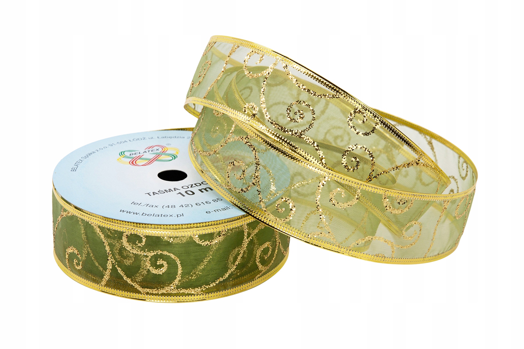 МАТЕРИАЛ ЛЕНТА С БЛЕСКНЫМ ОРНАМЕНТОМ ПРОВОД 4см/10м Оливково-ЗОЛОТОЙ