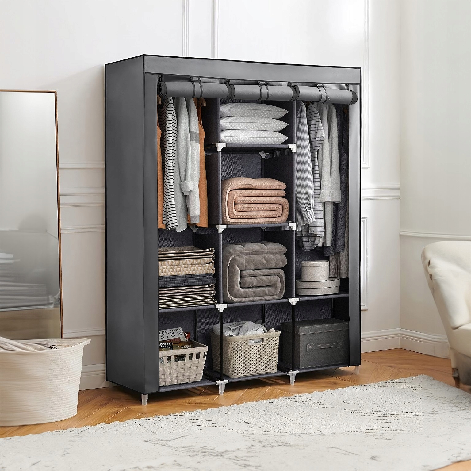 Шкаф построен на основе прочного металлического каркаса с качественными пластиковыми соединителями, что делает его прочным и быстрым в сборке – всего несколько минут! Идеально подходит для переезда, путешествий или когда вы часто меняете дом.