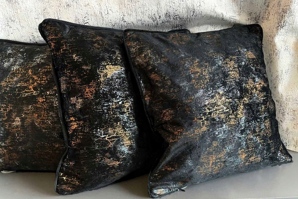 Предмет продажи – уникальная ткань Бархат в черном цвете. В отличие от большинства коллекций этой категории, имеет эффект растушевки. Материал чрезвычайно шикарный и способен преобразить многие интерьеры. Стоит отметить, что структура может претерпевать небольшие оптические изменения, что связано с тем, что волоски меняют свое положение под воздействием прикосновения. Это очень желательно, когда дело касается визуальных эффектов. Красивые дополнительные украшения ткани в цветах теплого, нежного золота и светлого серебра создают потрясающий визуальный эффект (левая сторона ткани без рисунка).