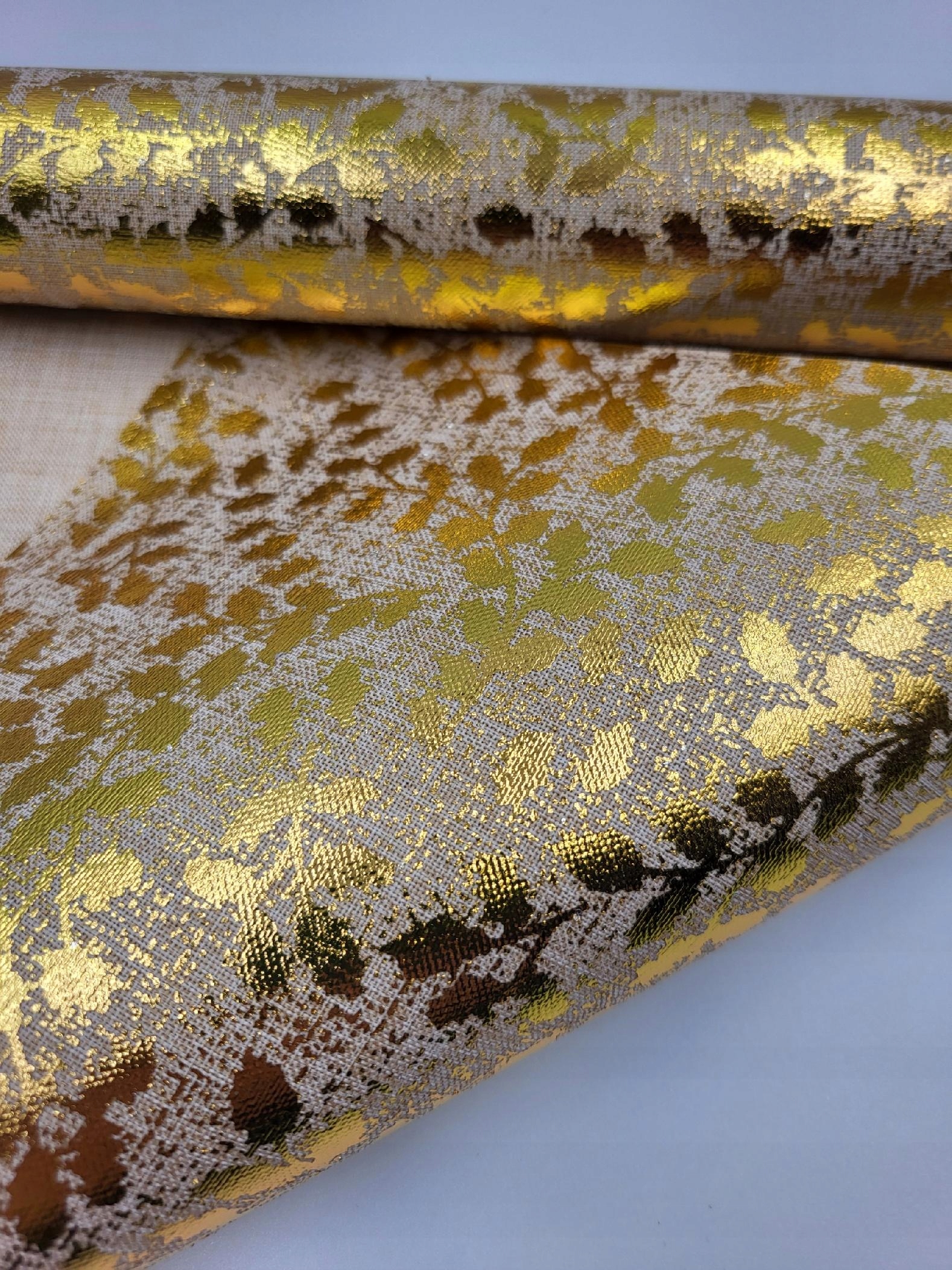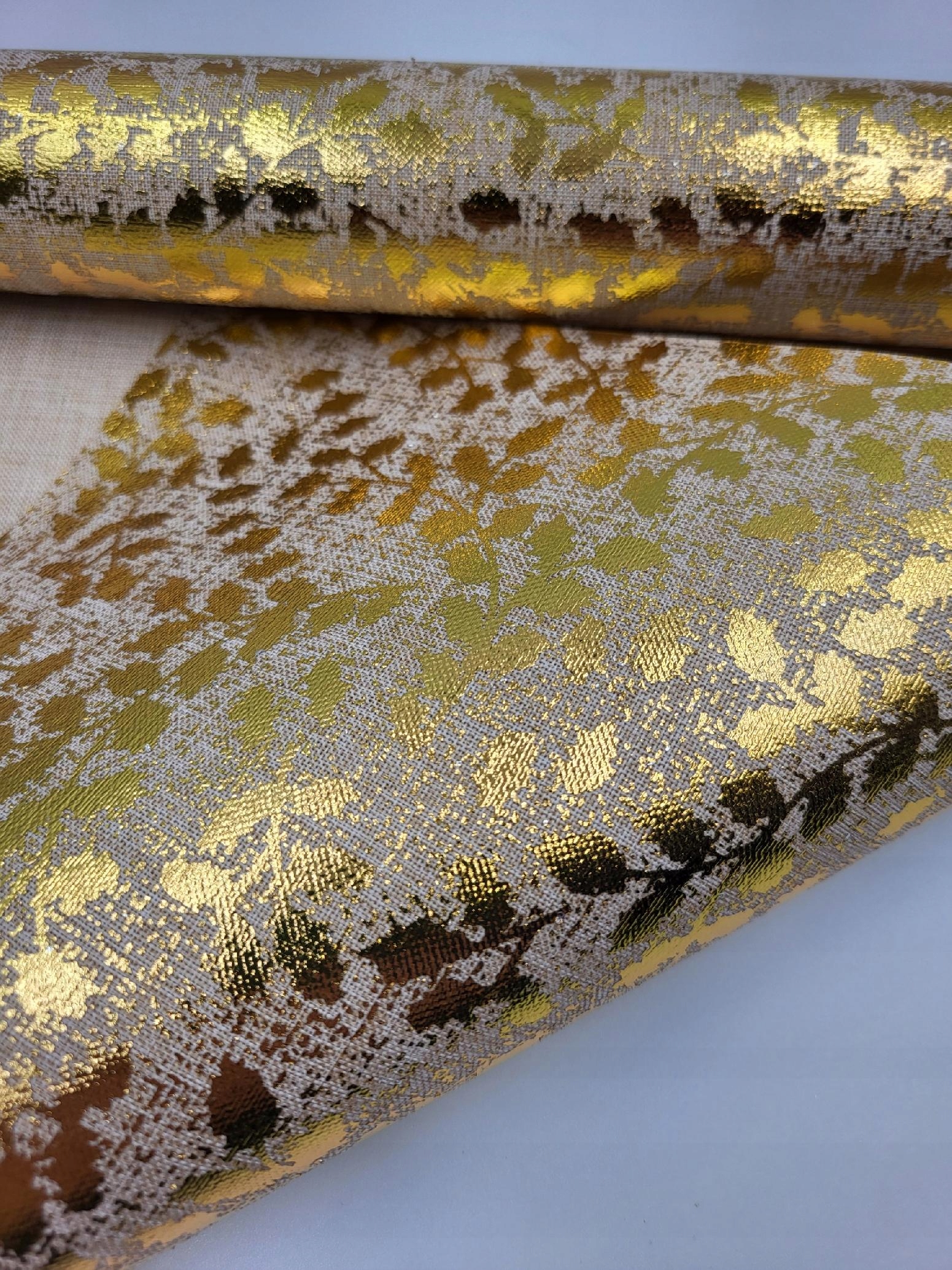 Декоративная ткань БЕЖЕВЫЙ цвет с мотивом из блестящих золотистых веточек.