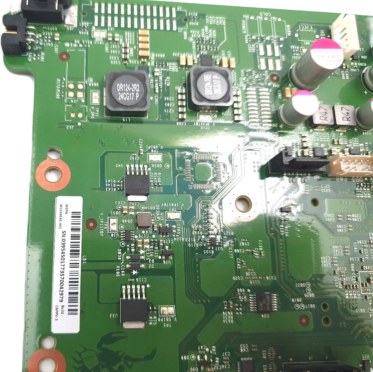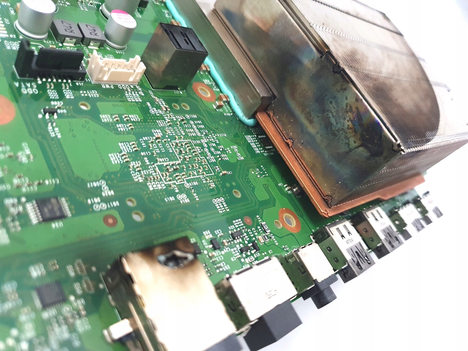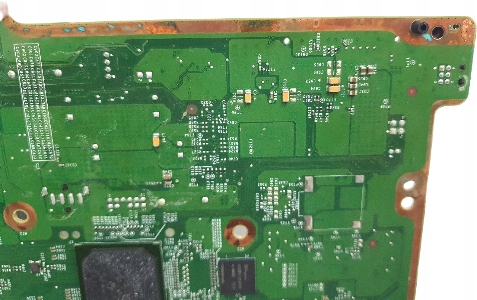 - Материнская плата повреждена. Видимые следы затопления и горения – см. фото ниже. После подключения питания взрывает вилки в распределительном щите.