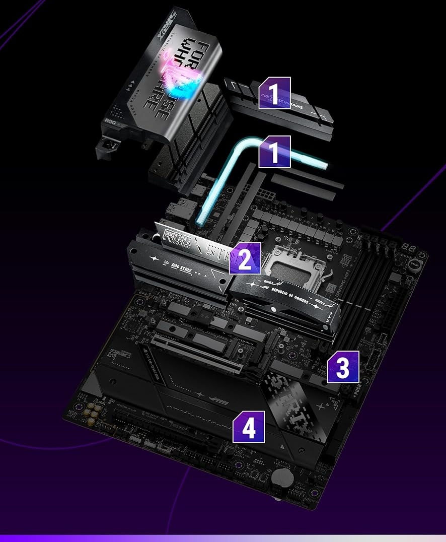 ROG Strix X870E-E предлагает полную поддержку PCIe 5.0 — как для видеокарт, так и для твердотельных накопителей. В распоряжении пользователя 5 слотов M.2 (3 PCIe 5.0 + 2 PCIe 4.0), все они оснащены эффективными радиаторами. Системы M.2 Q-Release, Q-Latch и Q-Slide позволяют устанавливать диск без инструментов.