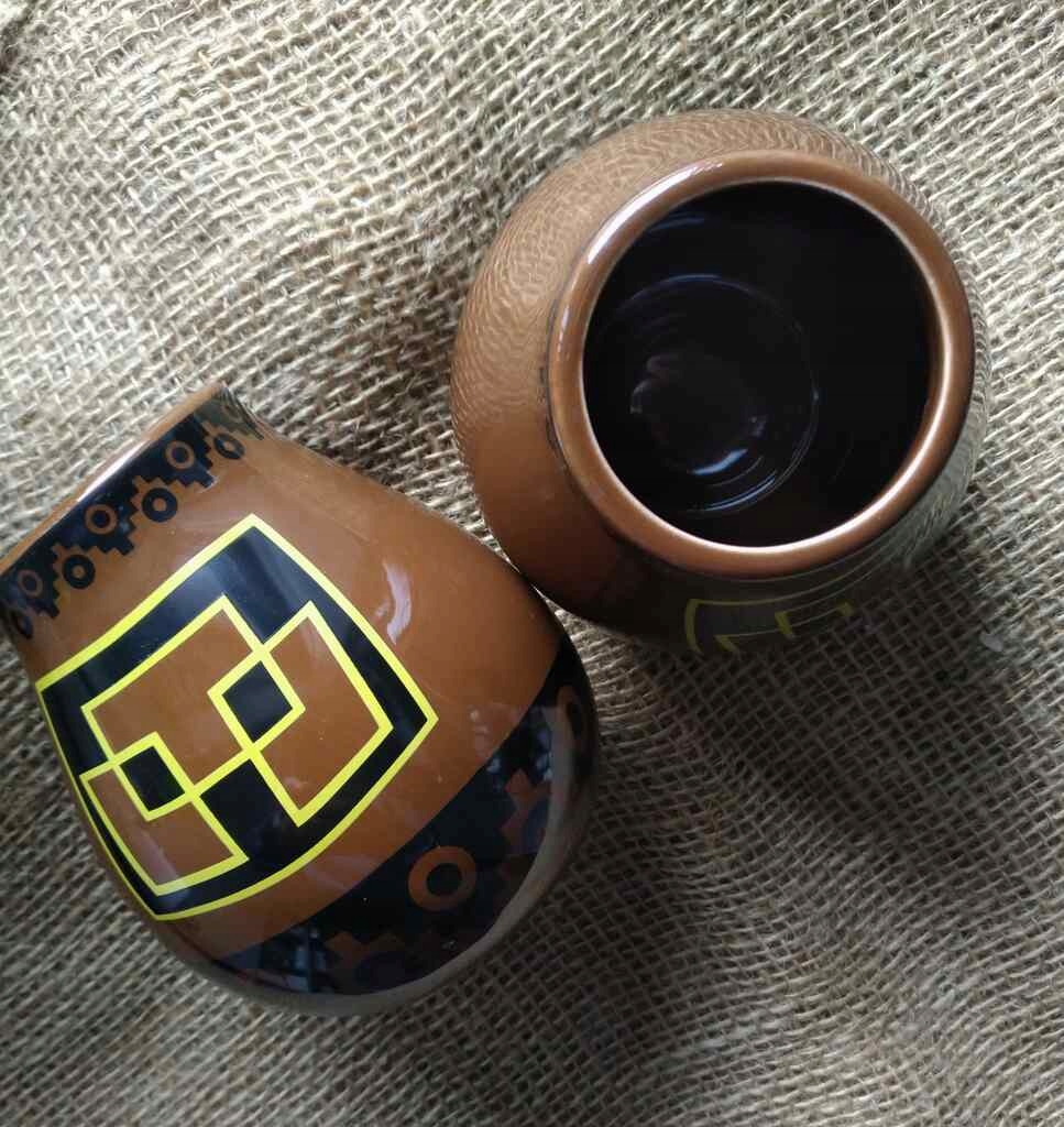 ➡️ Очень удобный керамический матеро, глазурованный снаружи коричневой глазурью, с красивым узором из накладывающихся кубоидов.