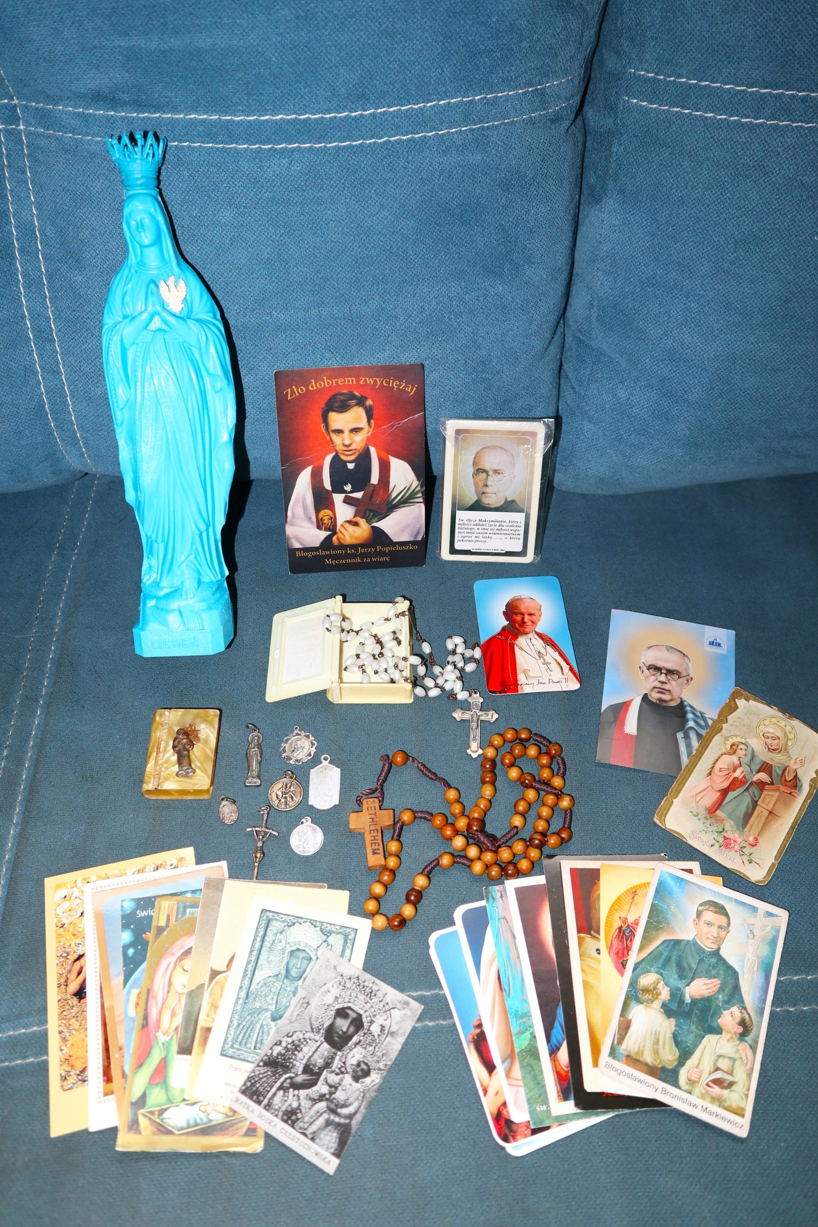 фигурка матери Божьей / контейнер с святой водой высотой 25 см, измерение 5 x 4,8 мм. Примечание имеет поврежденную корону !!! , Два розарея в случае и другие безделушки, видимые в прикрепленной цене фото, применяются к целую. Примечание не продает произведения !!!!!!!!!
