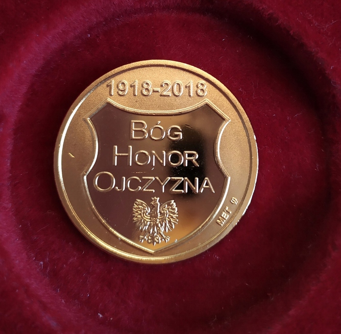 Аверс: На декоративном щите горизонтальная надпись в три линии: БОГ/ЧЕСТЬ/РОДИНА, ниже герба Польши – орел; горизонтальные даты над циферблатом: 1918 - 2018 гг.