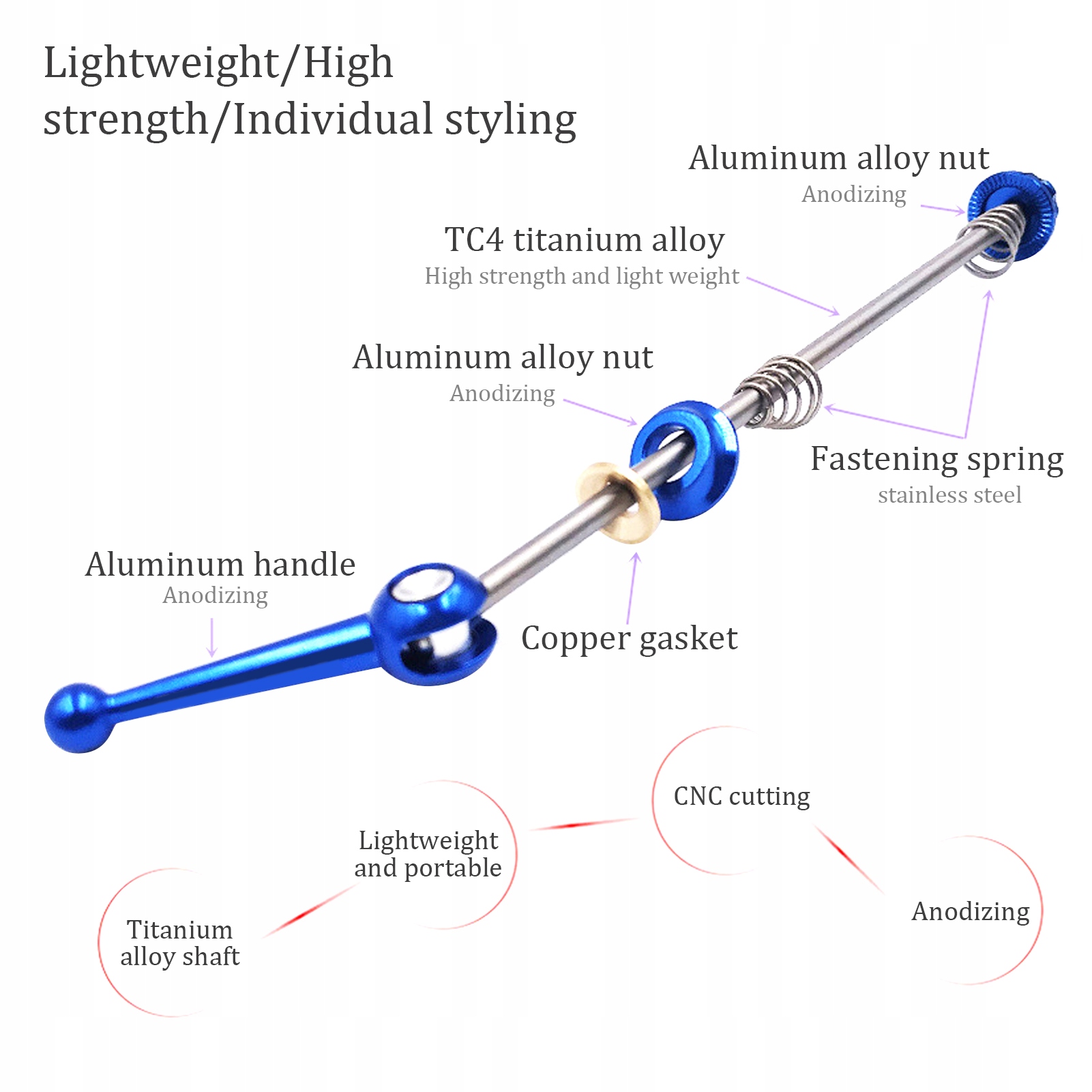 1. Ручка и гайка изготовлены из анодированного алюминиевого сплава, который имеет яркий цвет и не поддается ржавчине и покраске. 2. Вал изготовлен из титанового сплава, имеет низкую плотность, высокую прочность, хорошие характеристики и легкий вес. 3. Сочетание деликатной резки с ЧПУ и анодного покрытия, прочная металлическая текстура и качество изготовления демонстрируют качество. 4, подходит для колес с расстоянием между валами 100 мм/3,9 дюйма спереди и 135 мм/5,3 дюйма сзади, большинство велосипедов с дисковыми тормозами. 5. Простота настройки и быстрая установка, хороший выбор замены старых или сломанных деталей.
