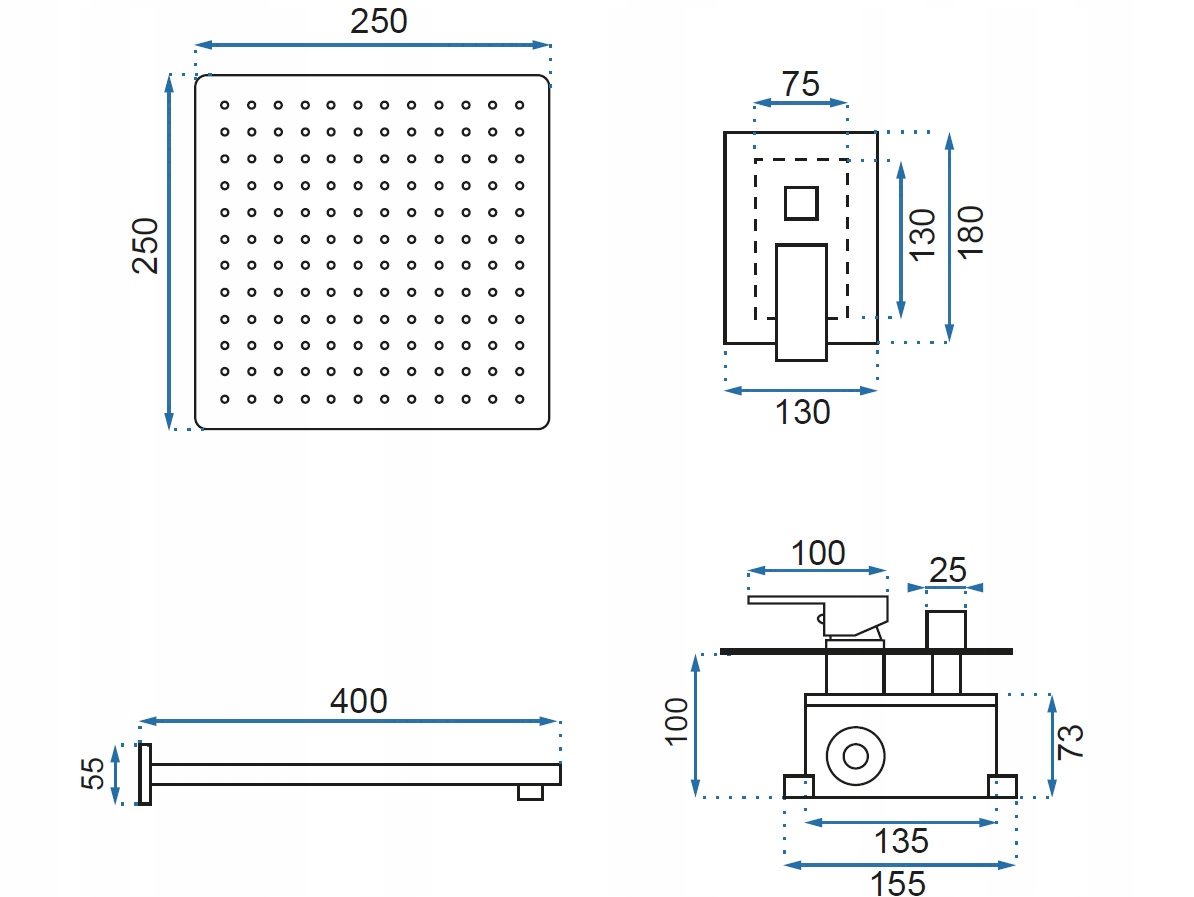 В комплект входит ультратонкий квадратный тропический душ толщиной 2 мм и шириной 25 см, смеситель с накладными и скрытыми элементами, шланг с душевой лейкой и набор точечных наконечников.