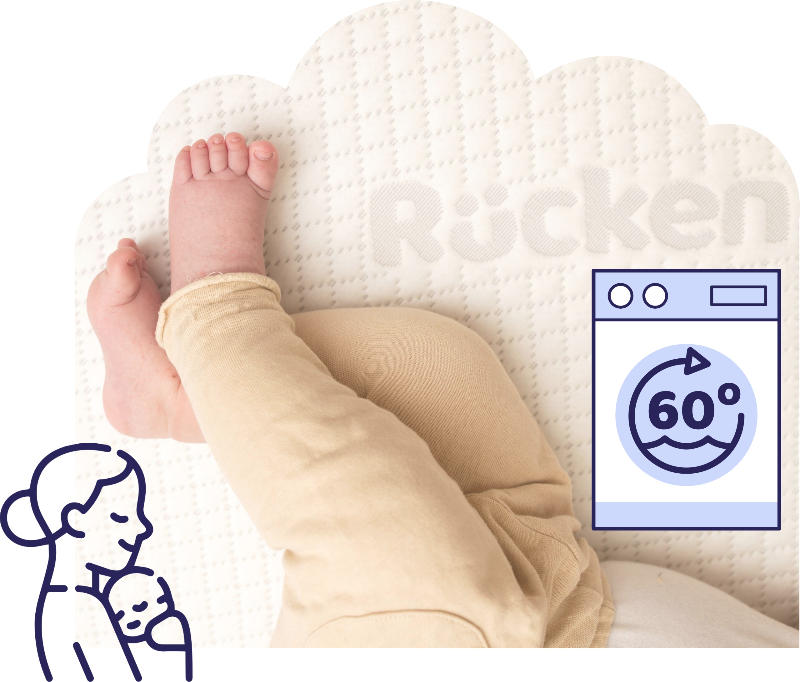 Стоит помнить, что чистота матраса кроватки имеет важное значение. Содержать матрас Rücken в чистоте чрезвычайно легко. Safe Zip 270° — система, позволяющая расстегивать и раскладывать чехол. Благодаря этому чехол можно удобно снять для стирки, а затем без проблем надеть обратно. Больше не нужно неудобно нажимать и раскладывать матрас в чехле!