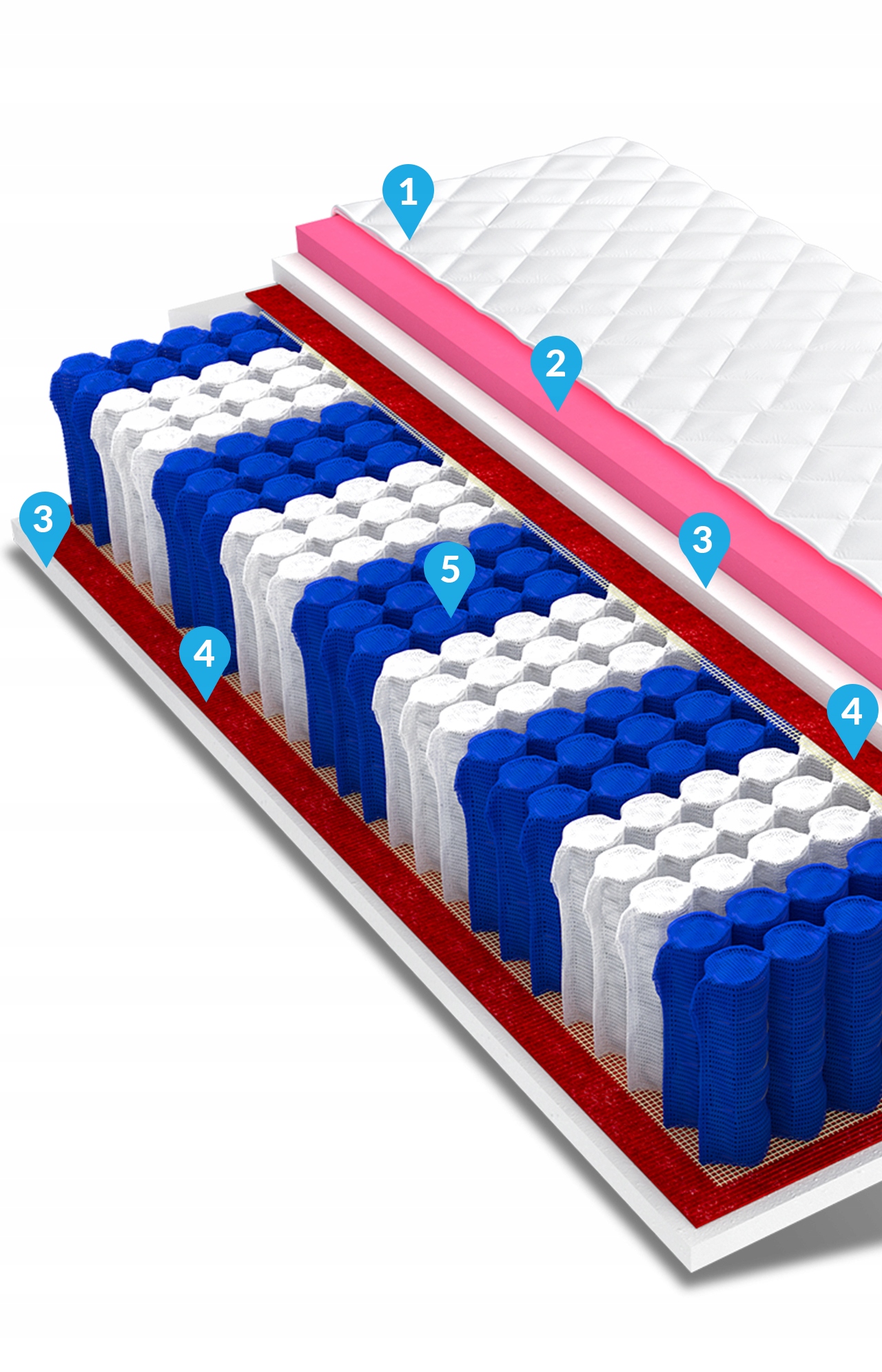 Благодаря зонам различной жесткости обеспечивается эргономичное положение тела во время отдыха. Независимая работа пружин исключает эффект прогиба большой поверхности матраса при приложении давления к его малой поверхности, поэтому любое вращение или сверление не будет ощущаться другим человеком.