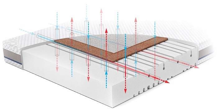 - Система вертикальных и горизонтальных вентиляционных каналов матрасной вставки, соединенных с 3D сеткой чехла,