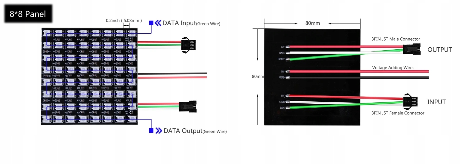 - Модель: пиксельный экран WS2812B, размер: 8 × 8 × 0,2 см (L × in × h), рабочее напряжение: DC 5V, мощность: 0,3 Вт/светодиод. Каждый светодиод индивидуально адресован индивидуально. Полем Каждый светодиод может быть установлен так, как вы хотите просмотреть сообщения или рисовать небольшие фотографии. Хорошо работает с Arduino, Raspberry Pi, Fastled-Bibliothek, Adafruit Neopixel, Rainbowdino, SP103E, SP105E, K1000C, T1000S и т. Д.