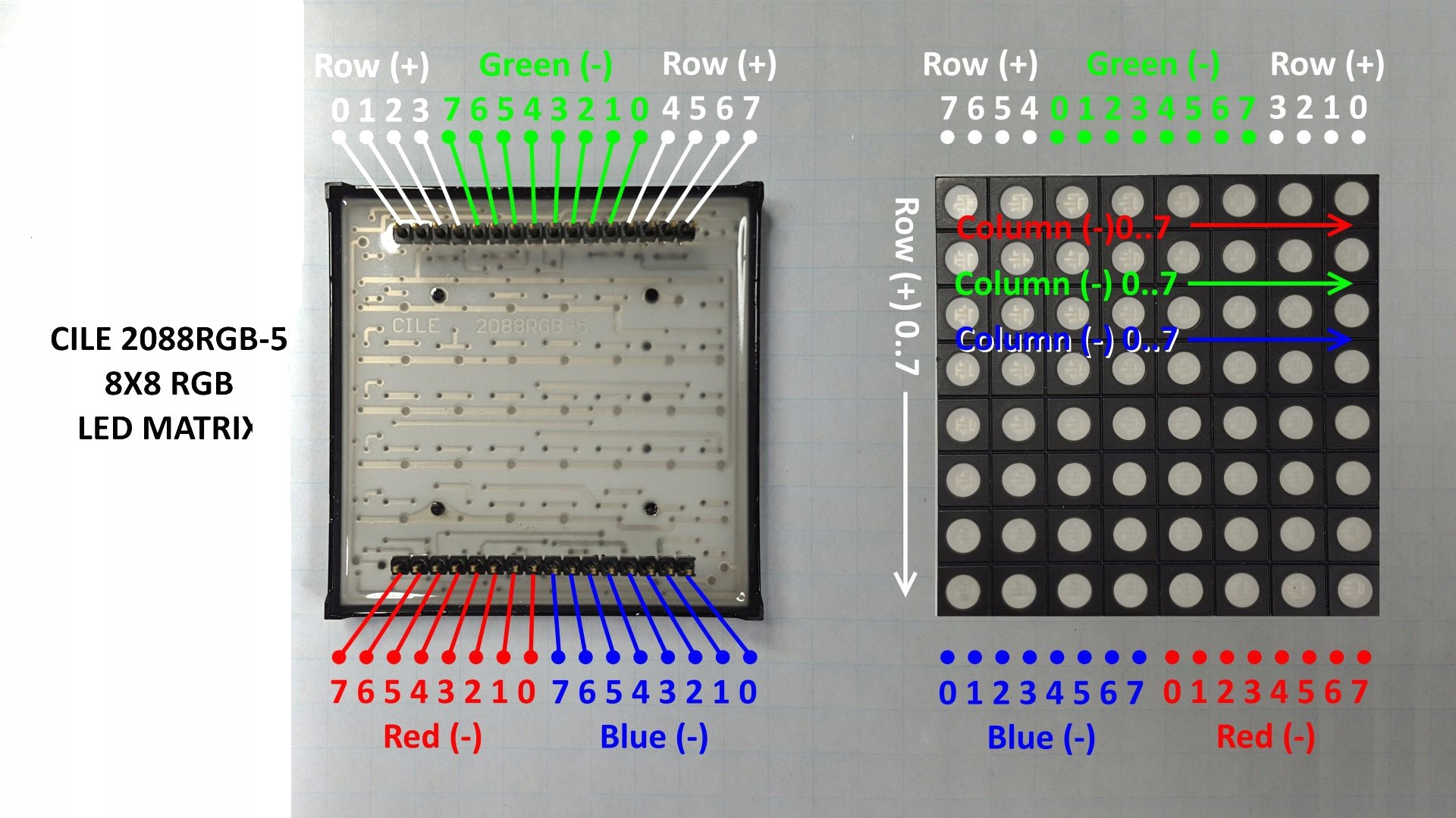Цветной матричный дисплей разрешением 8х8 светодиодов RGB с общим анодом. Для правильной работы необходимо 5 В.