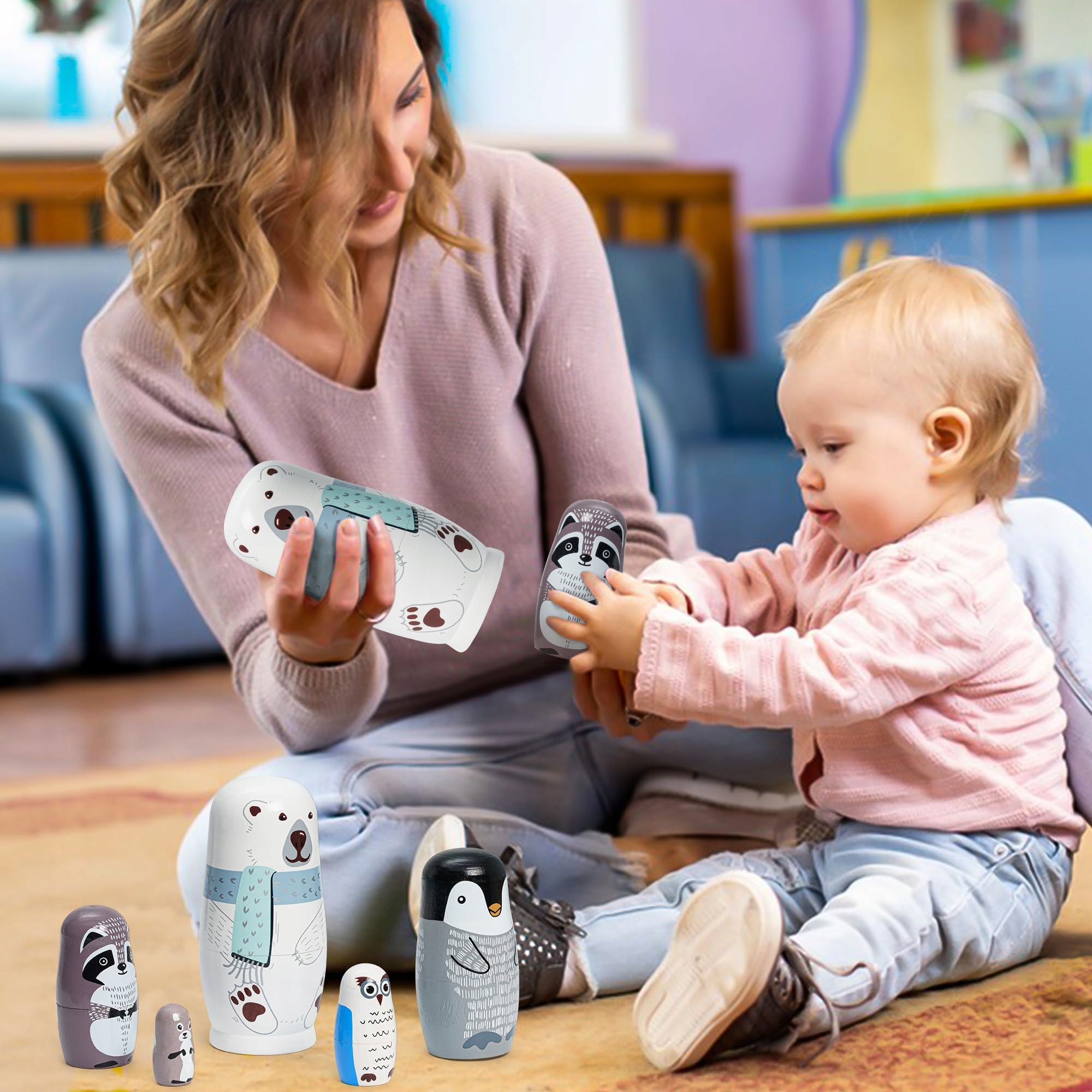 【Очаровательное появление мультфильма】 Матриошкиновые куклы содержат 5 животных разных размеров, включая белого медведя, пингвина, совы, крота. Они помещены в большее и выглядят как один.