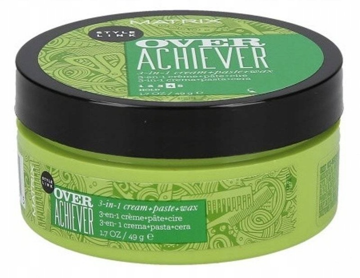 Matrix Over Achiever – косметическое средство, сочетающее в себе свойства трех продуктов: крема, пасты и воска. Благодаря кремовой консистенции им легко пользоваться. Паста позволяет создавать гибкие укладки. Однако воск гарантирует долговечность. Средство легко смывается с волос. Косметическое средство разглаживает пряди волос, прекрасно текстурирует и допускает небрежное разделение прядей, что дает эффект художественного беспорядка.