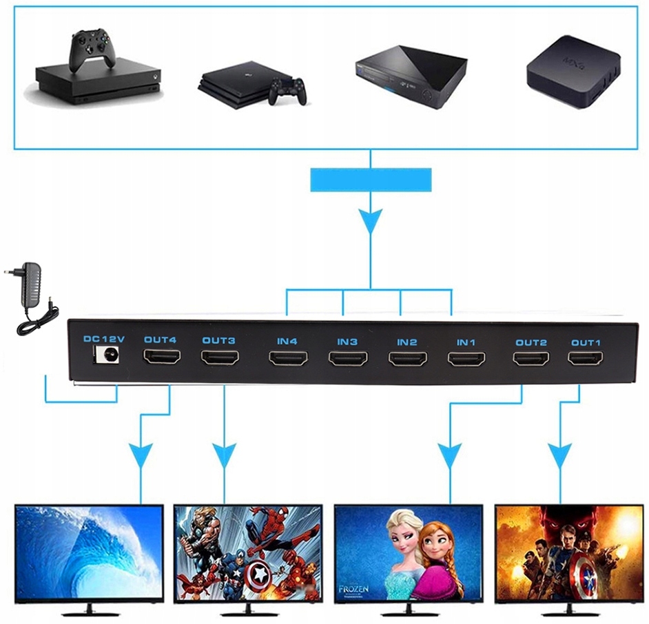 Матрица HDMI позволяет передавать сигналы с 4-х исходных устройств, оснащенных разъемом HDMI. до 4 устройств с входом HDMI (например, телевизор или проектор) одновременно или независимо друг от друга. Может работать как разветвитель или переключатель.