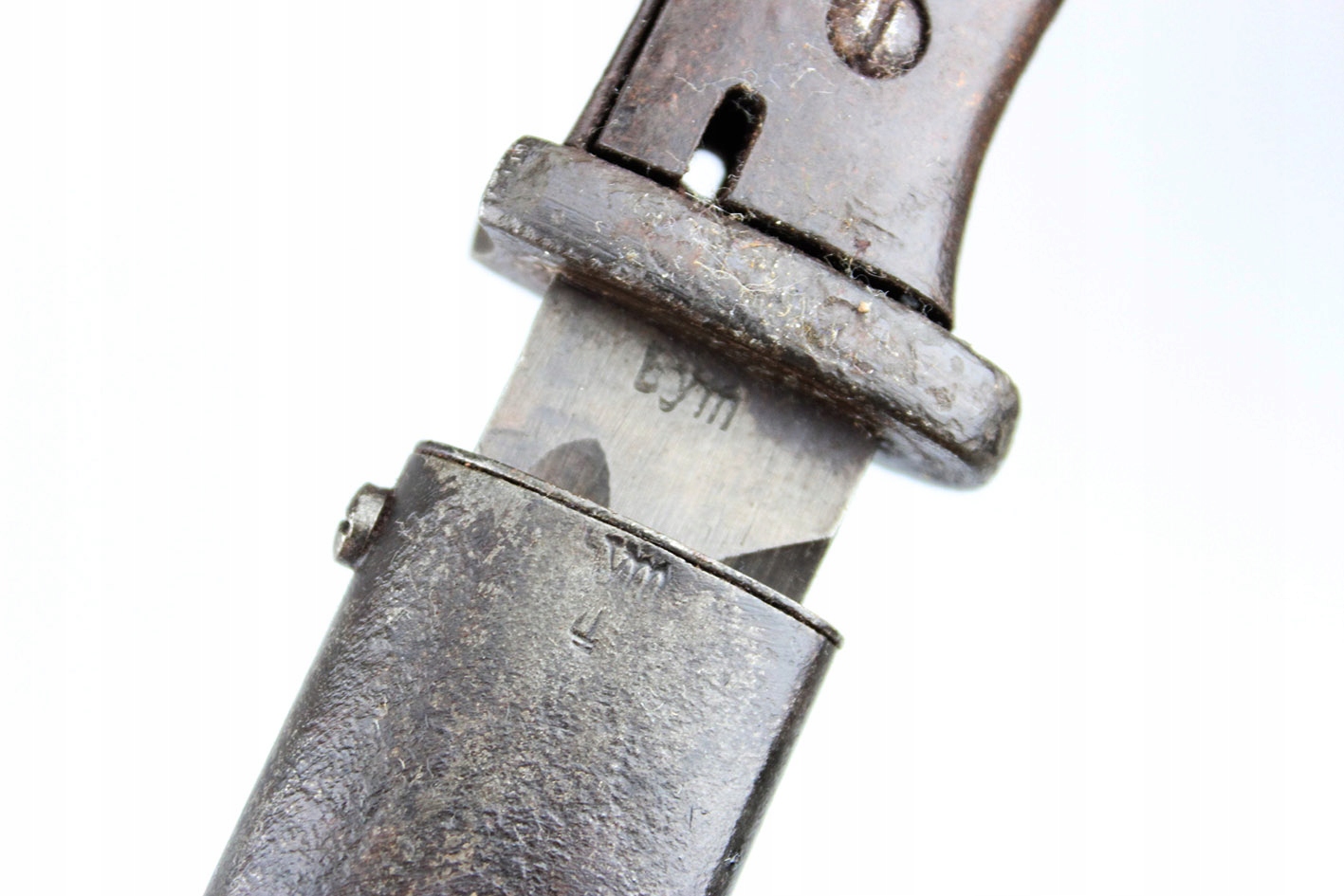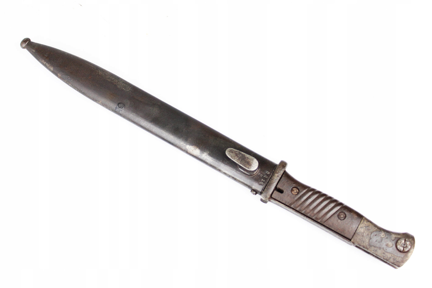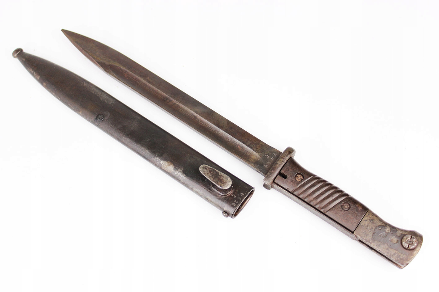 Второй и последний немецкий штык для винтовки K98 с третьего периода рейха, модель S84/98 с влагалищем. Австрийский продюсер: genossenschafts maschinenhaus der buchsenmacher в Ferlach . Байонет и влагалище подписали с тем же ярлыком производителя , которые будут численно совместимыми штыками с вагинальными числами 3414 e. Оба были сделаны в 1944 году. Замок плотно плотно удушья. Бакелитская облицовка. Что именно на фотографиях.