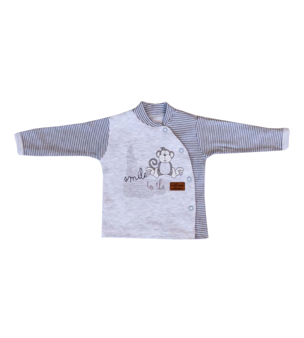 серого цвета с темно-серыми полосками преимущественно на рукавах. Спереди декоративная аппликация в виде милой обезьянки и нашивка. Кафтан имеет небольшой воротник-стойку и застегивается на конверт с безникелевыми кнопками, что облегчает одевание.