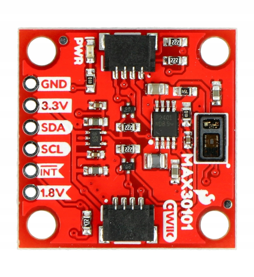 Датчик на базе чипа MAX30101 позволяет определять расстояние, частоту сердечных сокращений, дым и даже моргание глаза. Он имеет 3 светодиода и очень чувствительный детектор фотонов. Он обменивается данными через интерфейс I2C и имеет разъем Qwiic. Работает с напряжением 1,8 В и 3,3 В.