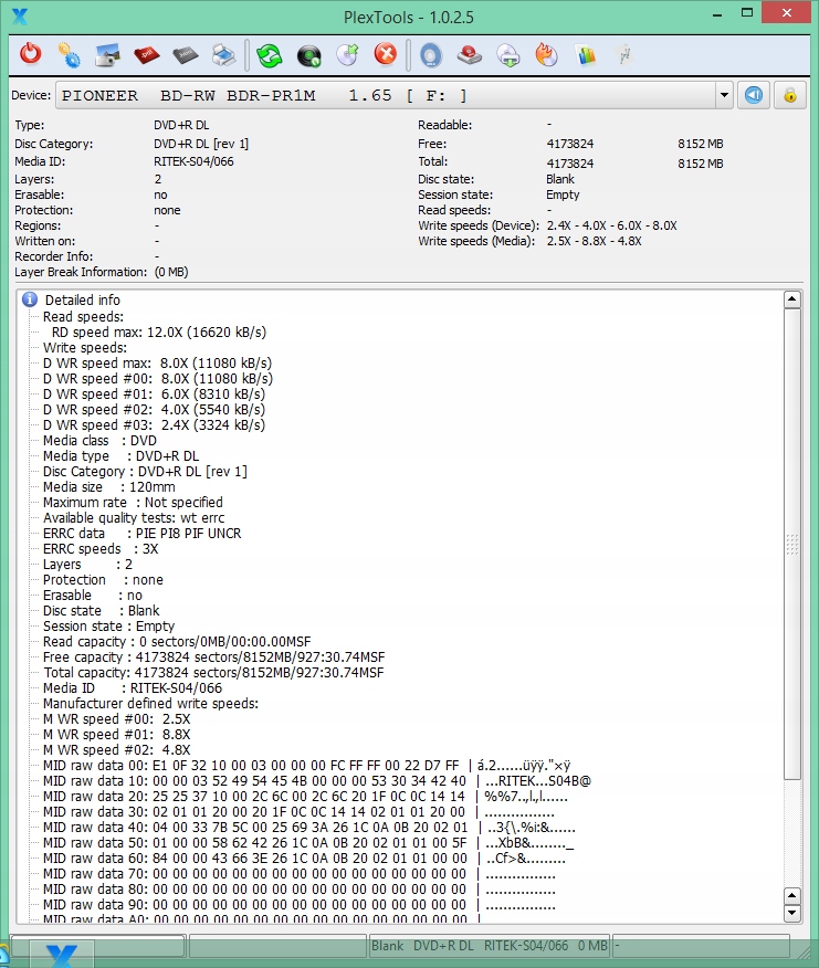 Носитель тестировался при чтении и записи на профессиональных накопителях Teac DV-W5000S JVC Archival Drive (~$3000) Pioneer BDR-PR1 \ BDR-S11JX и на нескольких случайных накопителях. Предлагаемый носитель представлен на фотографиях и скриншотах из диагностических программ.