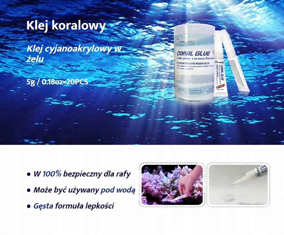 Maxspect Coral Glue идеально подходит для склеивания трансплантатов как мягких кораллов, так и ЛПС и СПС. Подходит для склеивания как всухую, так и под водой. Благодаря этому с его помощью можно склеивать не только коралловые породы, но и конструкции из камней, различные элементы аквариумного оборудования и декораций. Клей устойчив к соленой воде и, прежде всего, полностью безопасен. Благодаря особому составу он не оказывает вредного воздействия на обитателей рифов. Используя его, вы можете быть уверены в здоровье морских животных в вашем аквариуме. Он также подходит для ремонта оборудования, например, для заклеивания треснувшего корпуса внутреннего фильтра или для герметизации течи из негерметичной сантехники. Вы можете использовать его для склеивания каменной конструкции при установке нового аквариума, а также для подготовки трансплантатов кораллов в существующем. Этот клей также имеет быстрое время схватывания — 10 секунд. В каждом случае клей схватывается с одинаковой скоростью и силой.