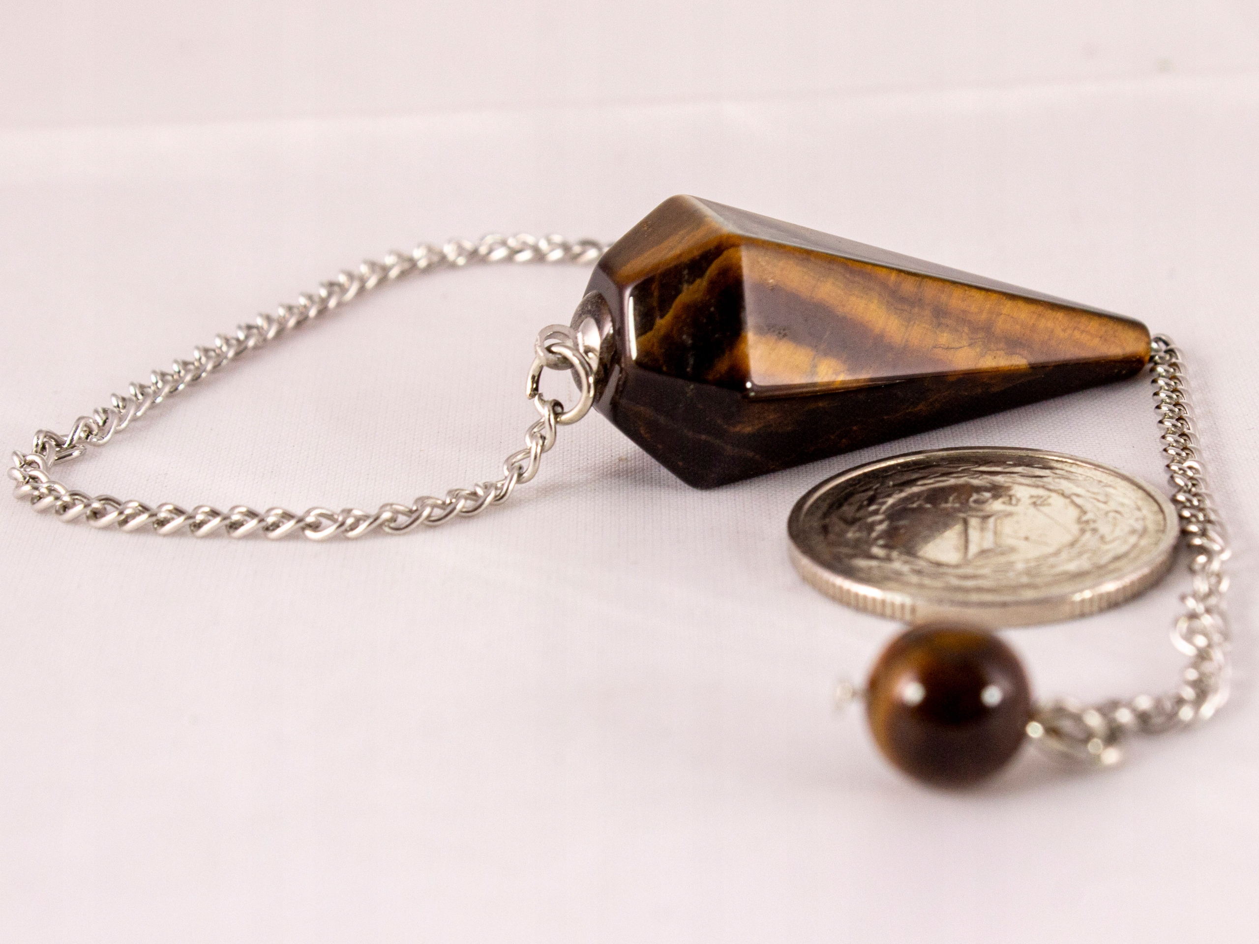Красивый амулет Маятник «Тигровый глаз» с 20-сантиметровой цепочкой из мелких звеньев с бусиной «Тигровый глаз» на конце.