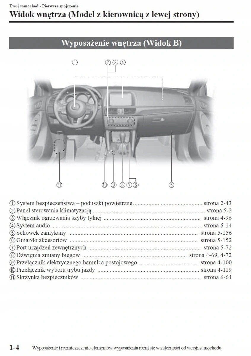 Руководство по эксплуатации Mazda содержит все версии оборудования и полезную информацию о том, как эффективно и безопасно использовать автомобиль, например: - индикаторы, контрольные лампы, открывание и закрывание - освещение и обзорность, сиденья, отсеки для хранения вещей, отопление, вентиляция, кондиционирование воздуха. - советы по вождению, эксплуатации, обслуживанию автомобиля - уровни жидкостей, проверка и доливка, аварийные операции, замена колес, предохранителей, замена лампочек - технические данные... и многое другое, дающее путешественникам ощущение безопасности и комфорта. Польское законодательство обязывает продавца приложить к автомобилю руководство по эксплуатации на польском языке. Руководство пользователя автомобиля новое, на польском языке.
